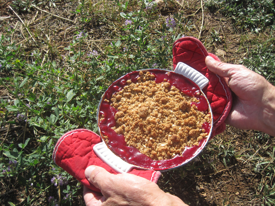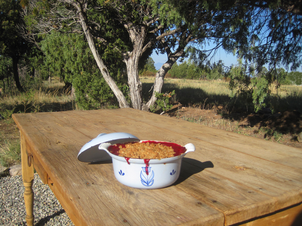 Do you all remember that fabulous Cherry Crumble recipe Kim Moss gave us early in the summer when cherries were so abundant on our local trees (see previous post Kim Moss’s Sumptuous Cherry Crumble)? Well, it’s fall now and the plum trees in Truchas have been laden with fruit. So Kim made a a delicious and, I have to say, stunningly beautiful Plum Crumble the other day. There is something about the purple/red color of this fruit once it is cooked that is simply hard to beat. I almost couldn’t EAT the stuff, my artist’s eye was so captivated by the visual! But I got over myself and dived in… much to my great gastronomic delight. So if I were you, I’d go get some plums and try this recipe. Warm out of the oven with a little Haagen Daz vanilla, it simply can’t be beat.