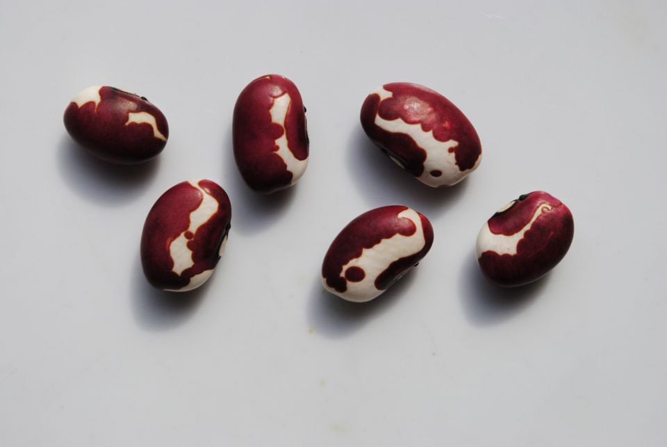 It wasn’t until the very end of September that I opened a dry pod one day and noticed something different: beans with oxblood and white markings, which worried me. I thought perhaps the beans had hybridized by being allowed to grow so close together, the bees cross pollinating all of the flowers. But I soon realized these piebald beans were the Anasazi caves, exquisitely marked, each presenting a different pattern, each perfect in its own way. I was dazzled. Completely smitten, my husband couldn’t pass one of several uncovered bowls of curing shelled beans without picking up a small handful and lovingly pouring them back in with a satisfying patter.