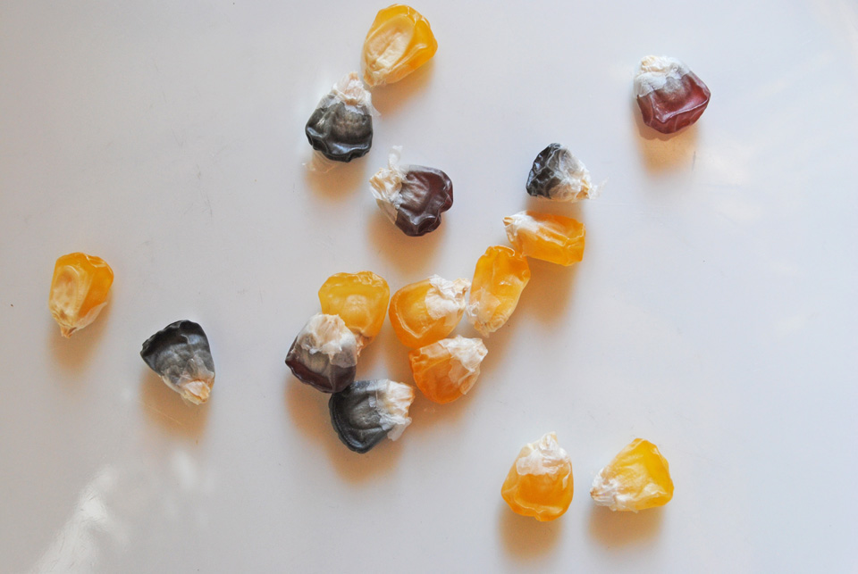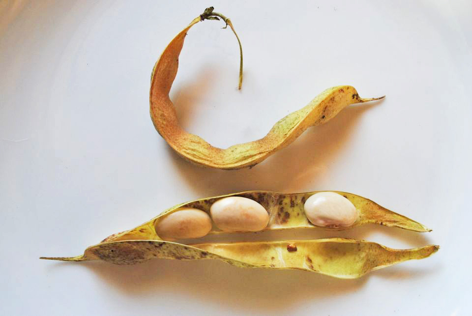 The afternoon before the first killing frost was predicted for the overnight, I harvested all of what remained on the vines, concerned about the many pods that were still green, surprised that the vine drying process was so slow. Not sure what to do, I decided to allow the pods to dry indoors and just see what happened. Day by day, as pods lost their green luster, thinned, and dried, I peeled and sorted the beans they had protected. The shelled beans—at first so irresistibly cool and smooth to the touch—continued to cure, becoming dense, shrinking back and hardening.