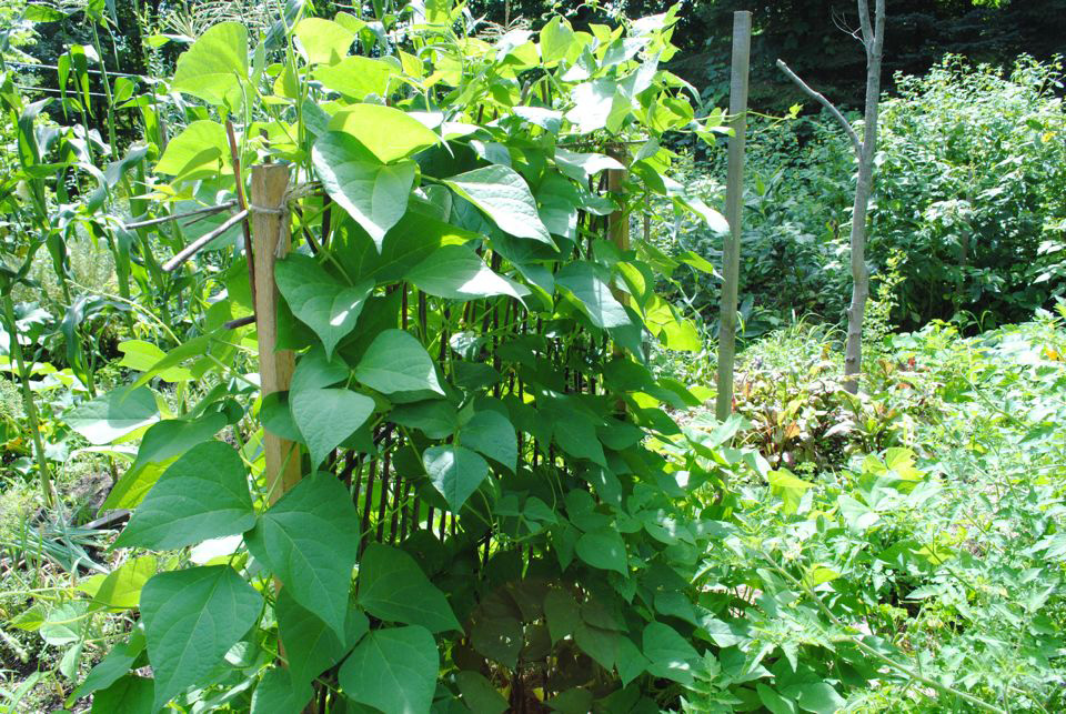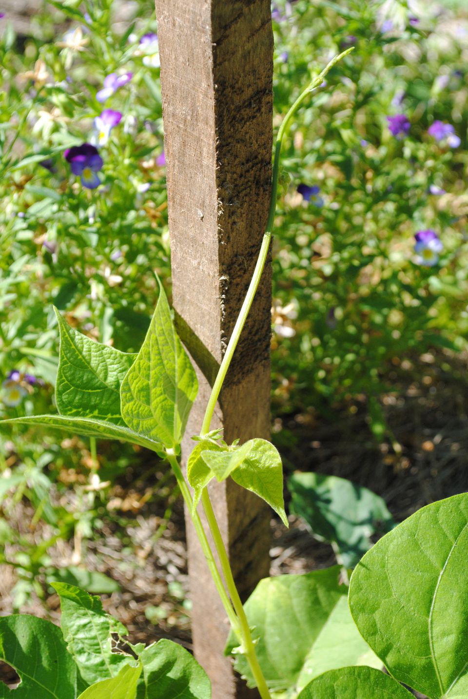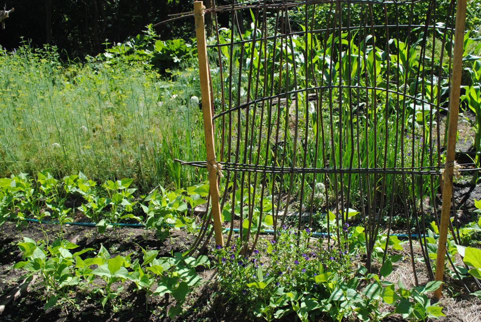 Fairly soon I realized the young plants needed a trellis of some sort, so I gathered some of the willow branches I had cut back in February and saved, not knowing what they might come in handy for but sure I’d find a use for them. Though it was too small to support more than one section of the fairly large bed, the trellis that I lashed together looked like it would do the job. During the busyness of the planting season, however, I had neglected to label the beans, and soon I was no longer sure which of the three types of beans we had planted in each section in the bed. The plants all looked the same, and I had begun to doubt what I thought I remembered about where Eammon and I had put the vining beans versus the so-called bush beans. By now they all seemed to be climbers. What else had I missed?