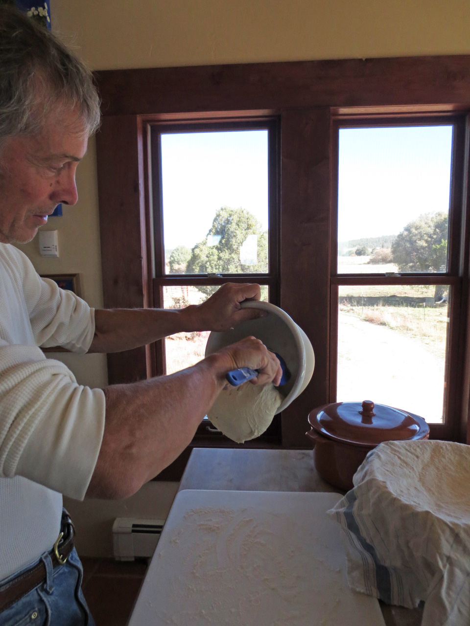 What better to do on a chilly fall day, temps down to a crisp 21 degrees, fire blazing in the wood stove, than to make a golden loaf of bread? And who better to do it than Kim Moss (see previous post A Very Mini Artist Colony in New Mexico)? Here are his thoughts on bread making, followed by his recipe and steps for making the perfect country loaf, previously published in the Santa Fe New Mexican: