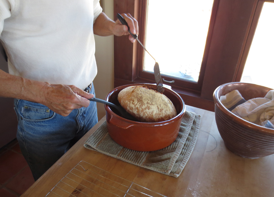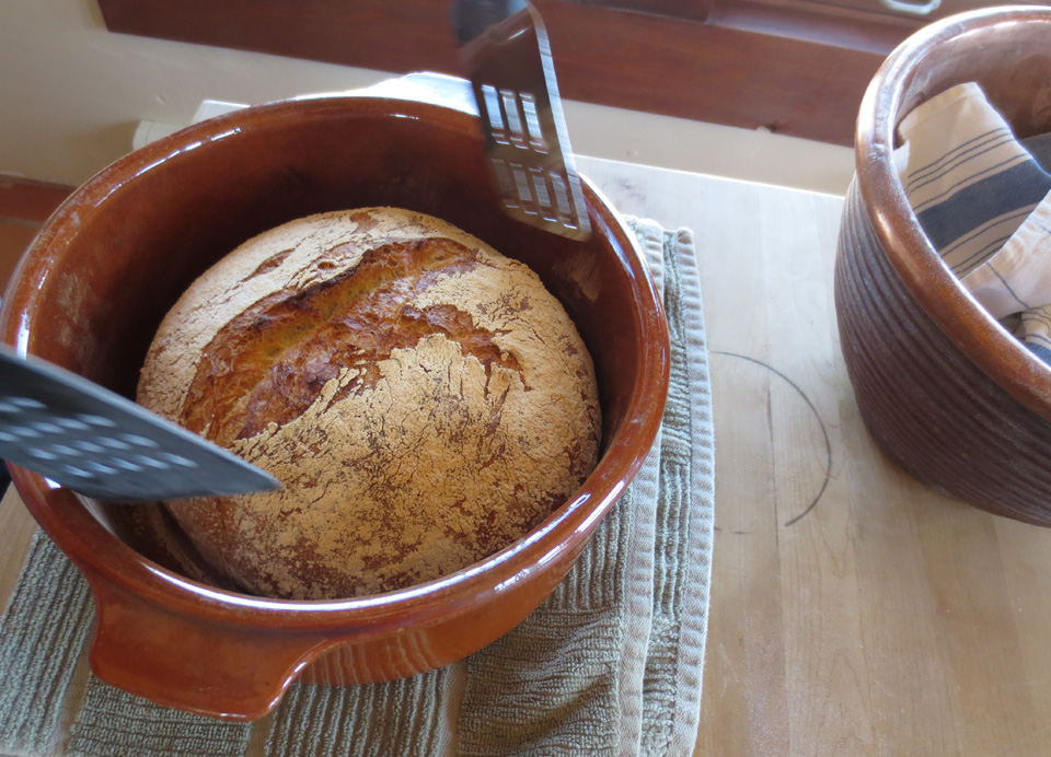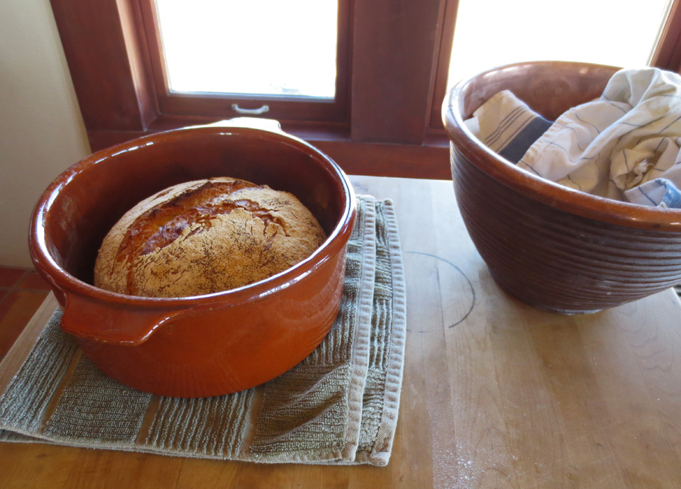 The size of the container mattered as well. I settled on a French earthenware casserole that had enough room to leave some space around the loaf. The final result is amazing — a round loaf that you cannot tell wasn’t flown in from someplace in Italy, France or Spain, fired in ancient wood-burning ovens.
