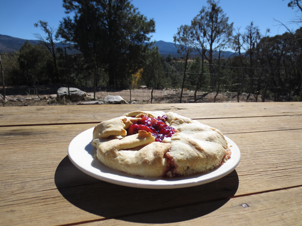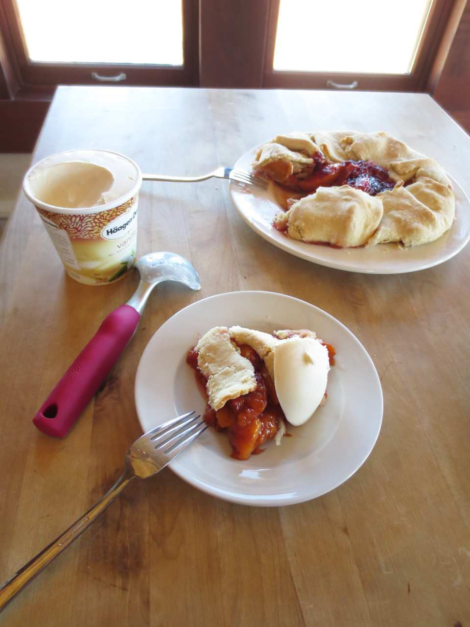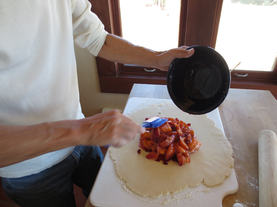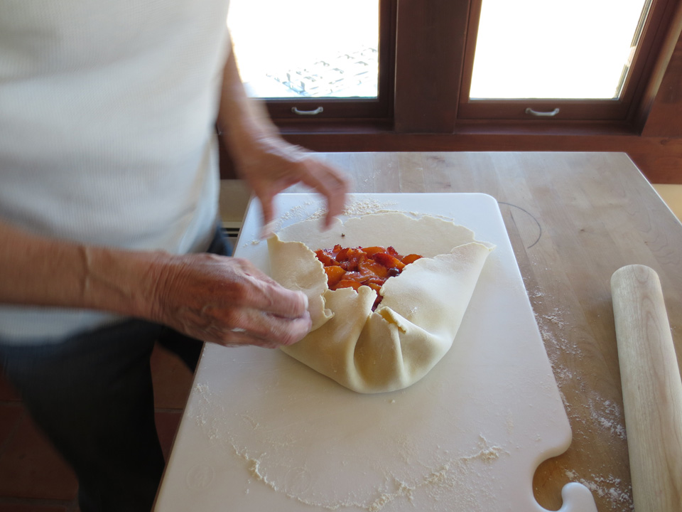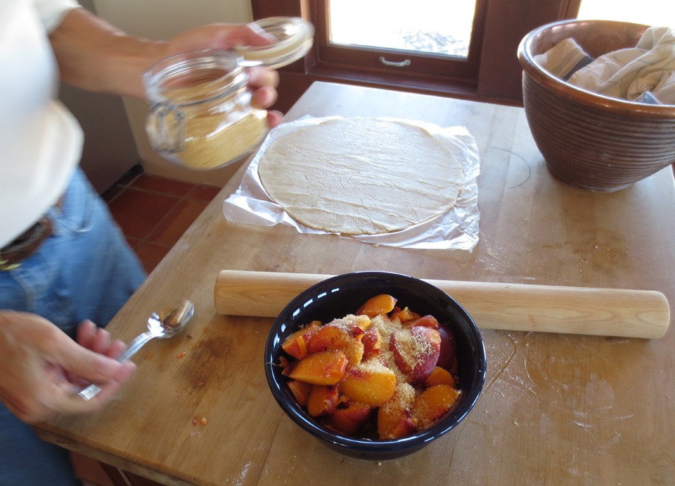 Kim made this recipe up as he went along (see previous post A Very Mini Artists Colony in New Mexico). He was planning on using a store bought crust I had in the freezer, but that didn’t work out, so he made his own crust. And he wanted to remind you all to check in your refrigerator for items you might use. Get creative. He mixed lingonberries and guava jam to make a sort of glaze on the crust and also to top the whole tart off. As an afterthought he felt it may have been better to use a pie dish. But, I’m here to say that this Country Peach Tart was every bit as good as it looks.