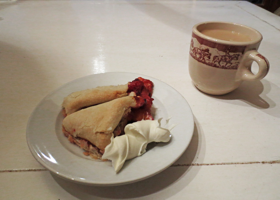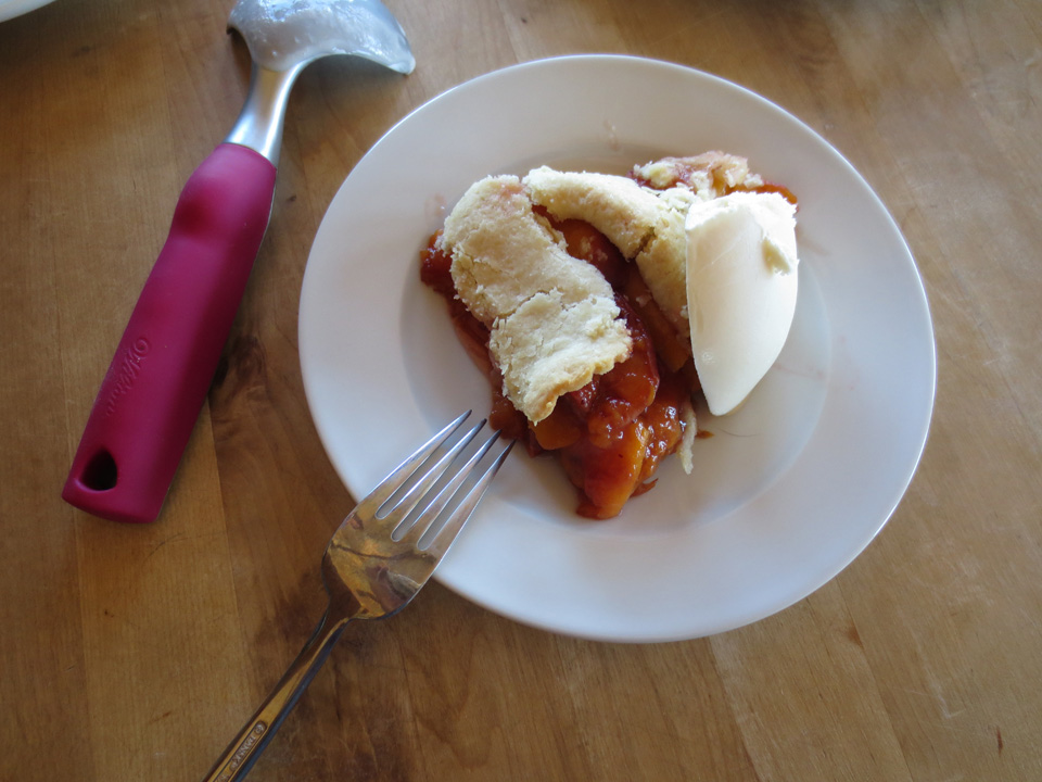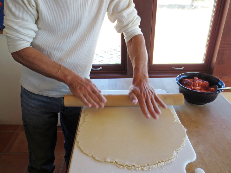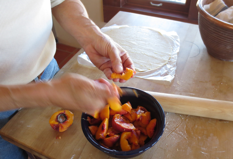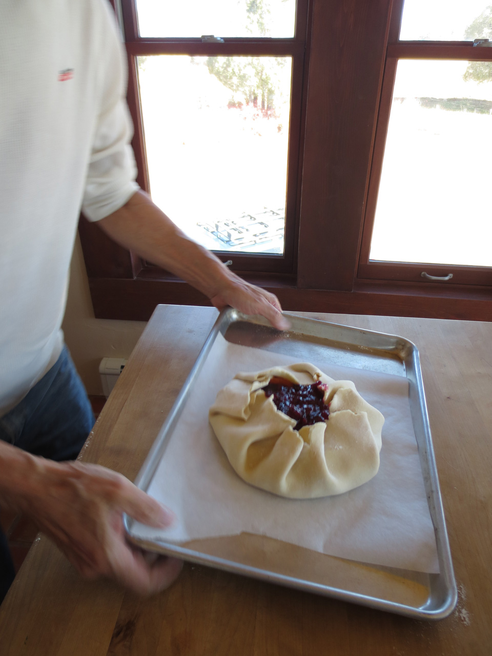 Kim made this recipe up as he went along (see previous post A Very Mini Artists Colony in New Mexico). He was planning on using a store bought crust I had in the freezer, but that didn’t work out, so he made his own crust. And he wanted to remind you all to check in your refrigerator for items you might use. Get creative. He mixed lingonberries and guava jam to make a sort of glaze on the crust and also to top the whole tart off. As an afterthought he felt it may have been better to use a pie dish. But, I’m here to say that this Country Peach Tart was every bit as good as it looks.