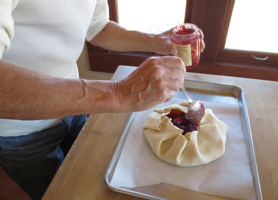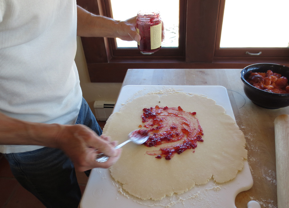 Use whatever you’d like to make a “glaze.” Kim used lingonberries and guava jam mixed together. Spread it on the center of the crust: