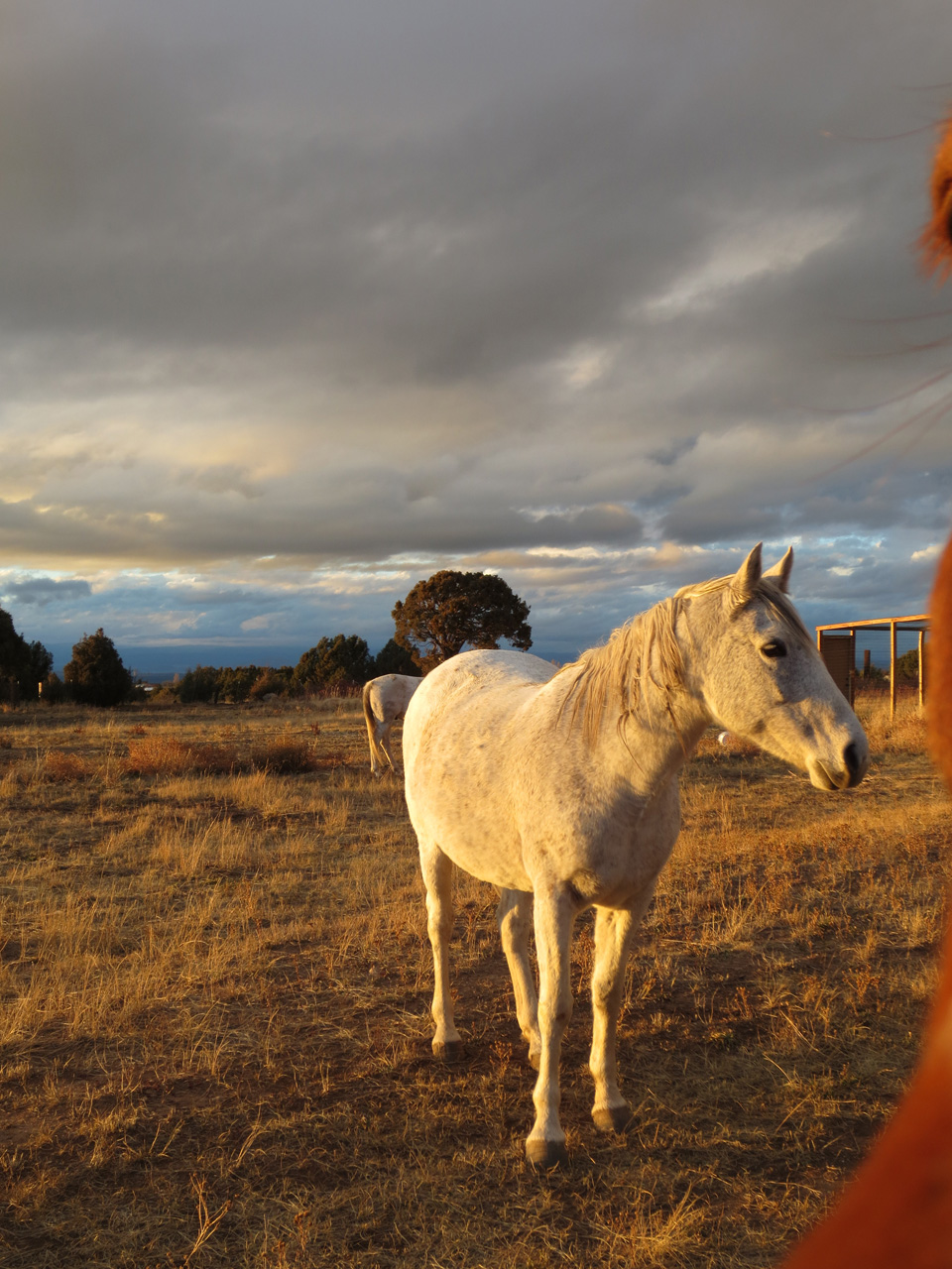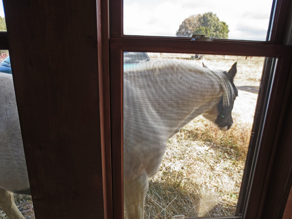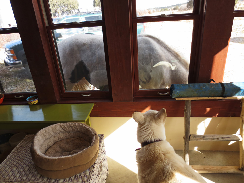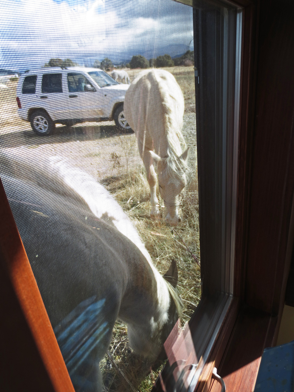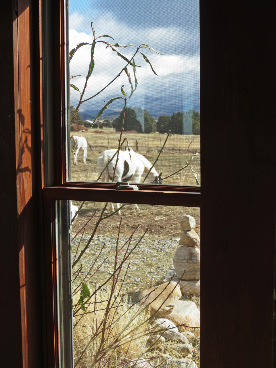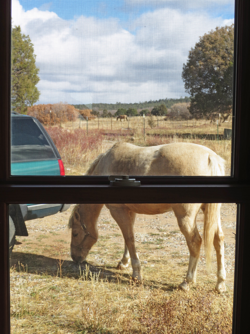 And just when I thought I had this new “structure” integrated into my life, a new day dawned and the word must have gotten out because there are two MORE horses in the yard as I write this–right here in the studio windows, big as life…