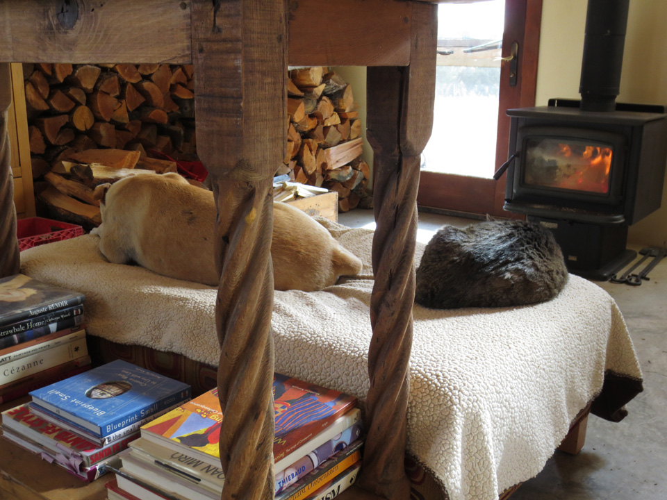 There is a fire blazing in the wood stove. The animals are all snug and safe in their various special places.