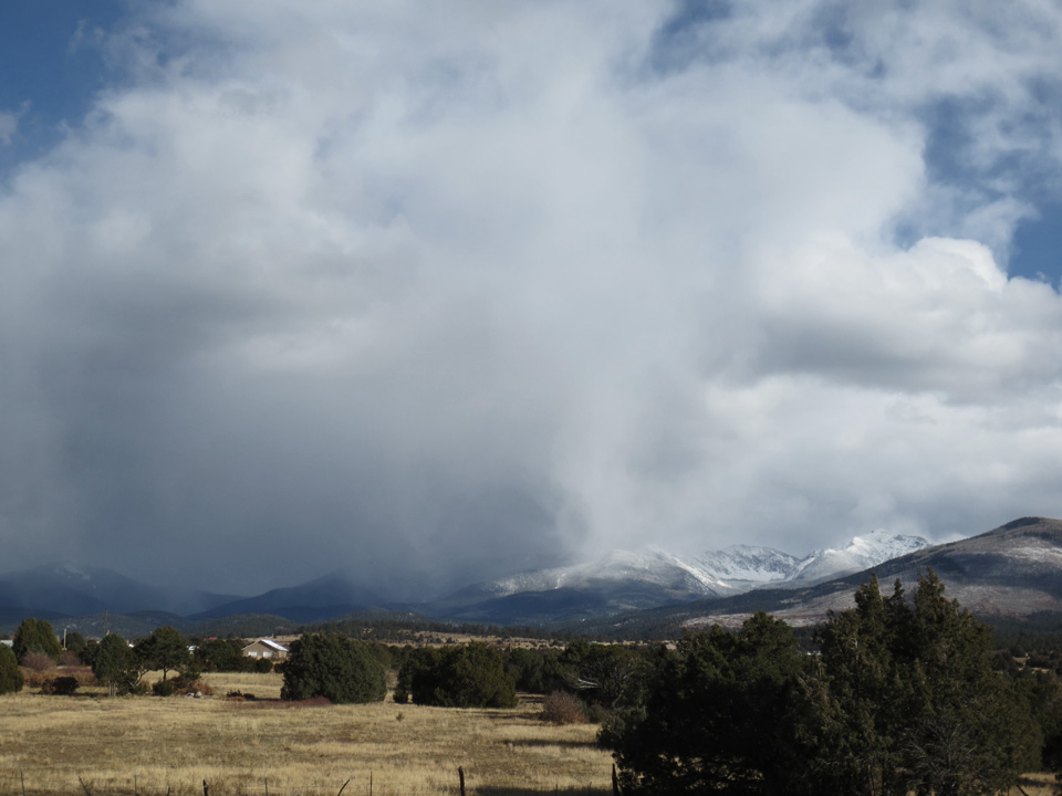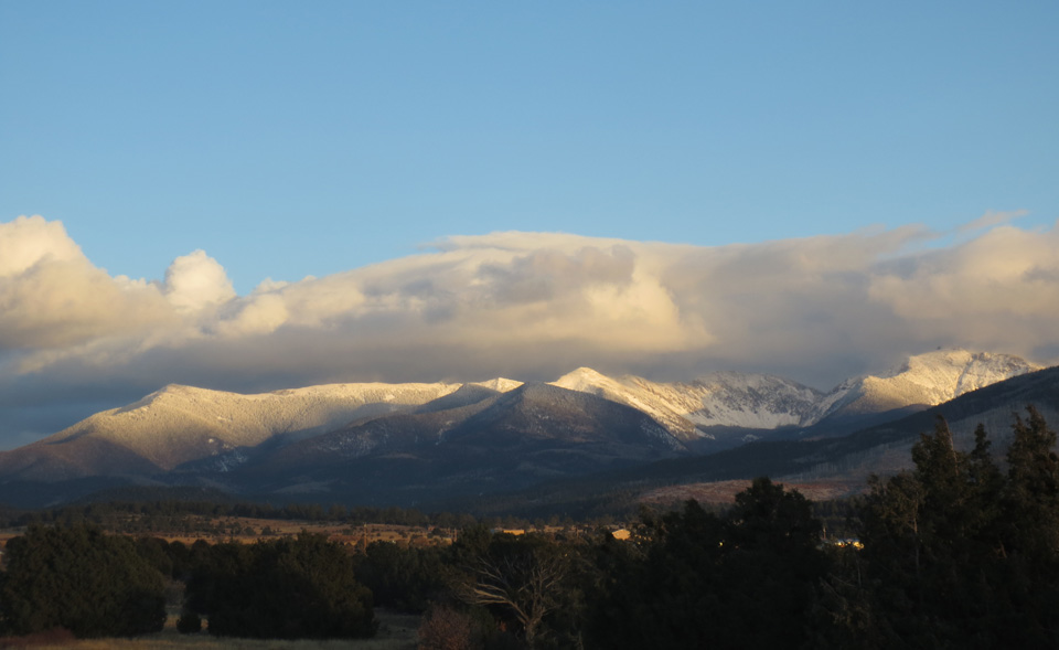 Okay, let me set the scene. It has been very, very cold and stormy. The wind was fierce for two days and the temps dipped down to 10. It’s the southern edge of that storm Colorado got that brought with it a couple of feet of snow up there. We were supposed to get snow too, but it only snowed on the mountain. I love that. I live at 8500 feet and, in this context, I don’t think of MYSELF as being on the mountain. I reserve that status for Truchas Peaks, our 13,500 foot elevation mountain that I see from my land.