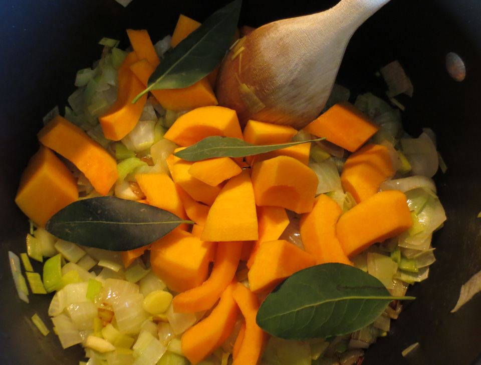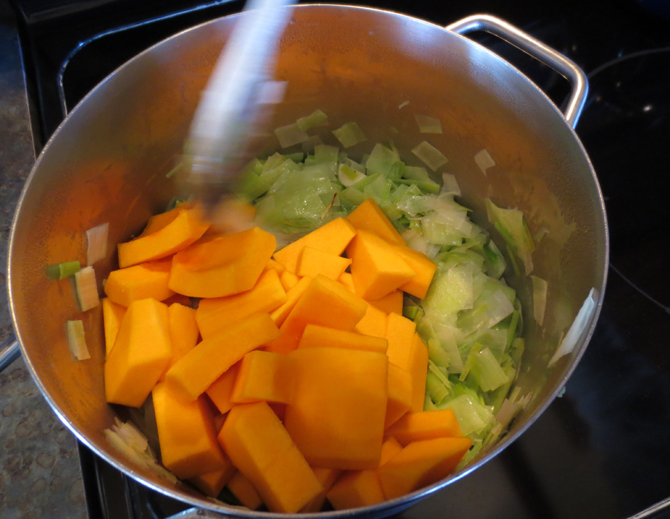 Saute the onion, leeks and garlic in butter until soft and then add the squash: