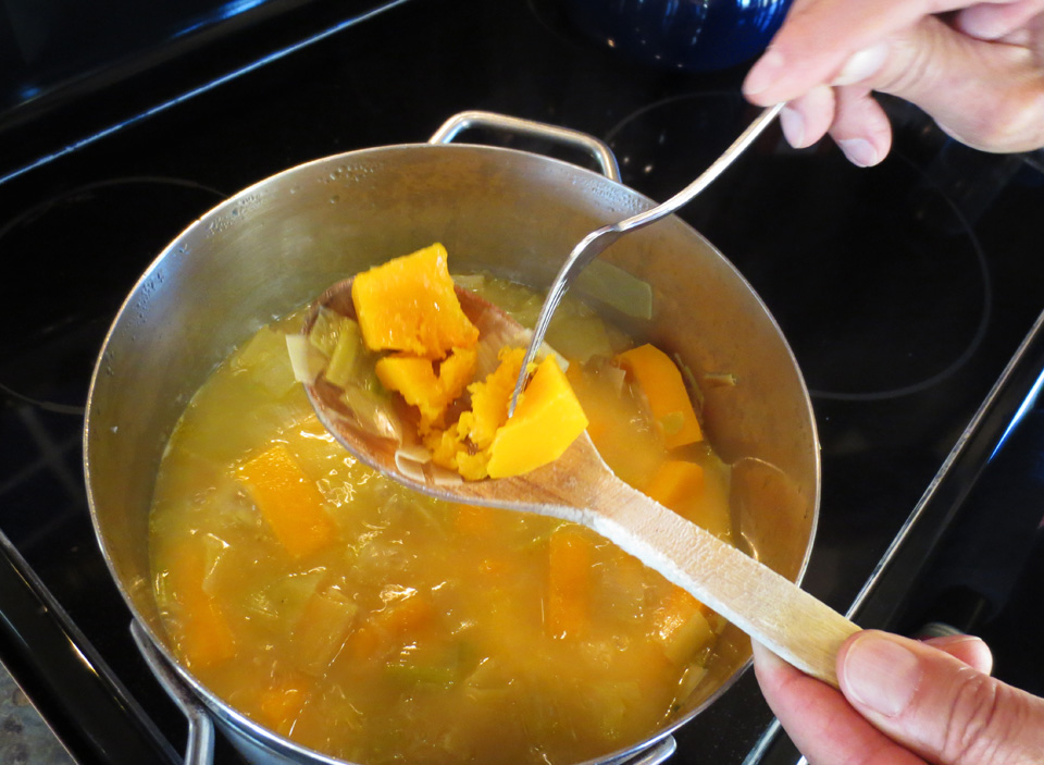 Bring to a boil and then reduce to a simmer and cook until the squash breaks apart with a fork:
