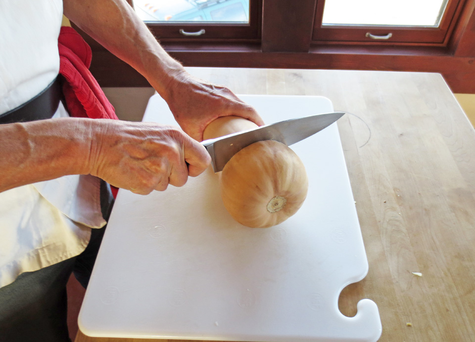 Prepare the squash by first cutting off the larger end about 1/3 of the way down. This will expose the seed pocket: