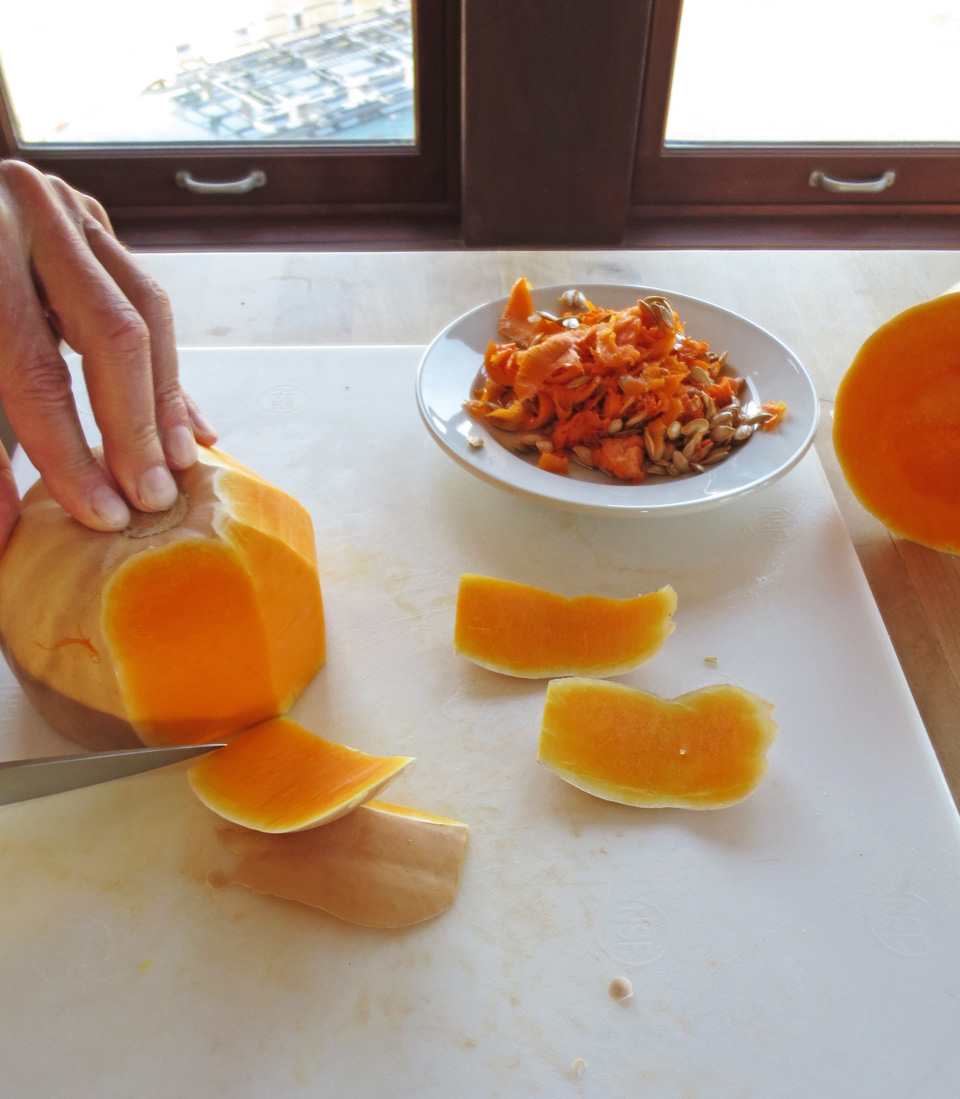 Peel the entire squash and chop into chunks: