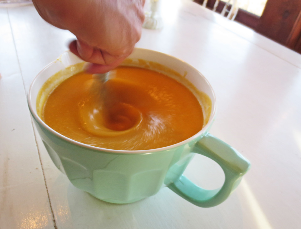 Whisk well and gently reheat on the stove. Be careful not to let it come to a boil because that would turn the bright orange color to a dull brown: