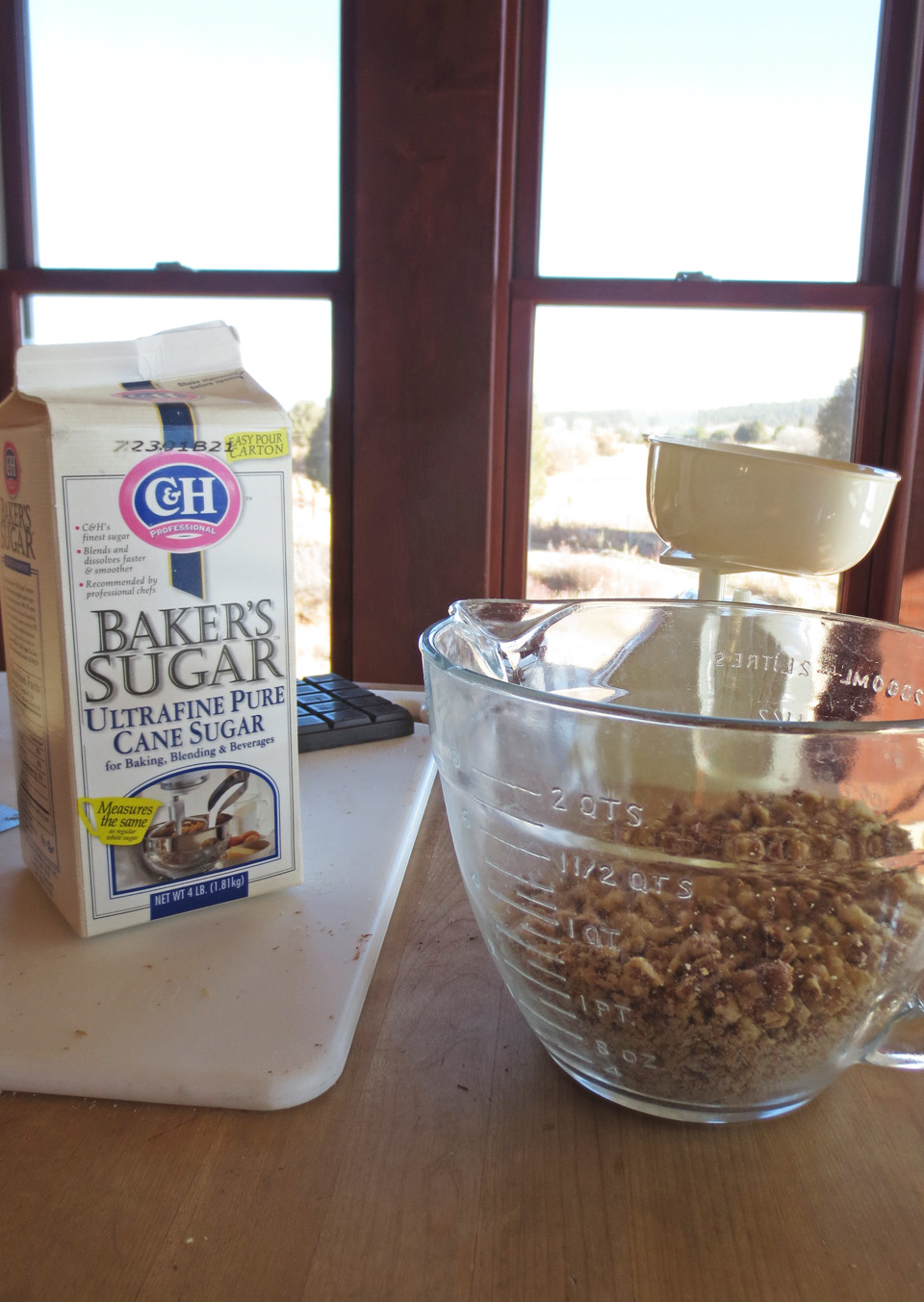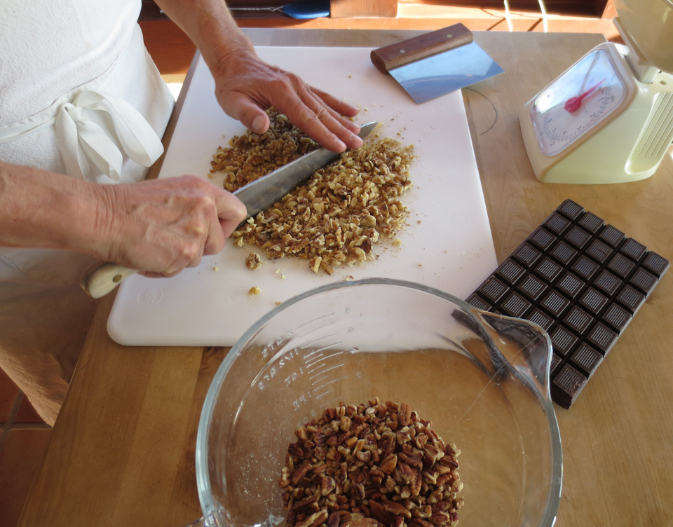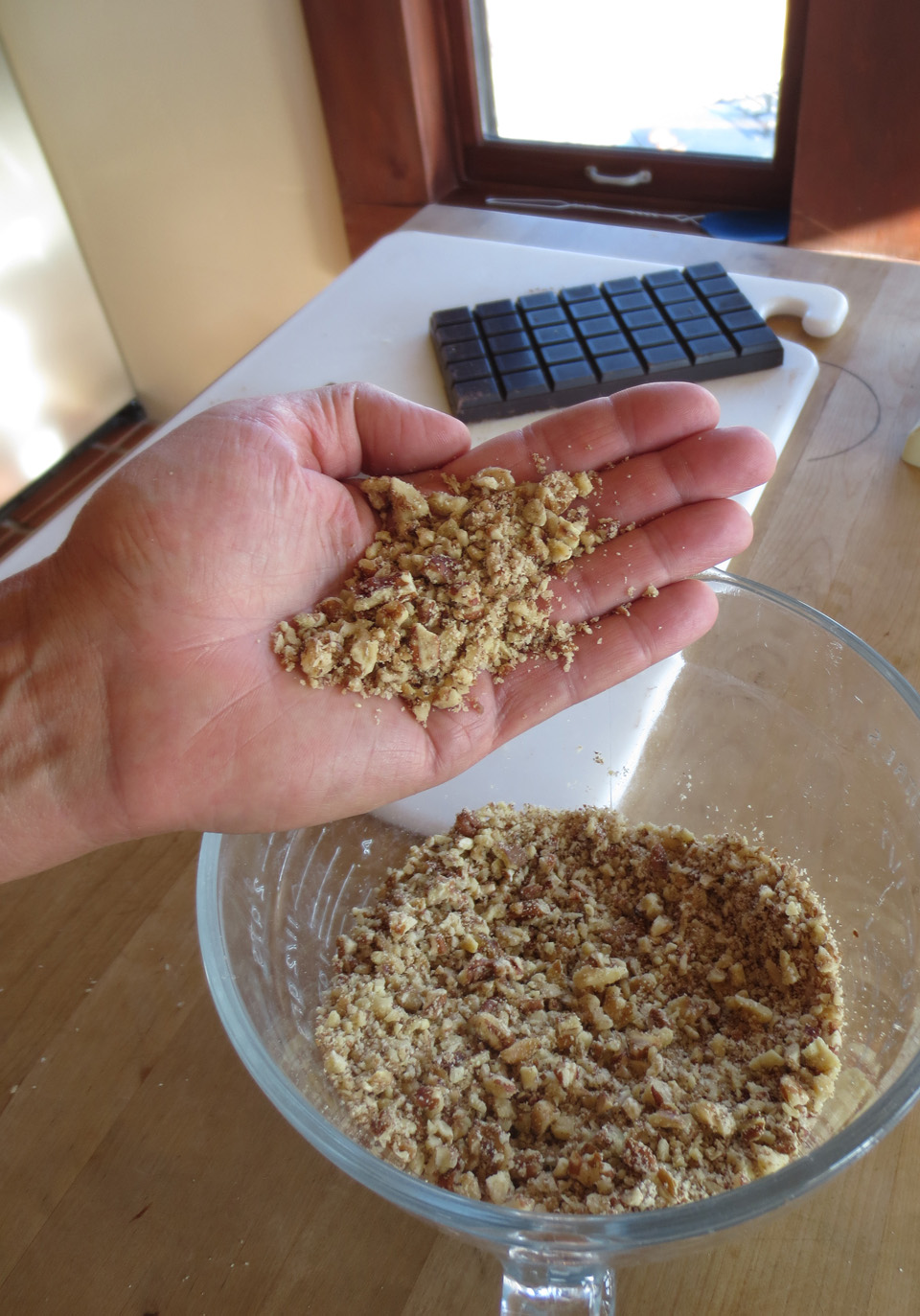 Chop nuts in food processor or by hand till quite small (somewhere between small and fine).