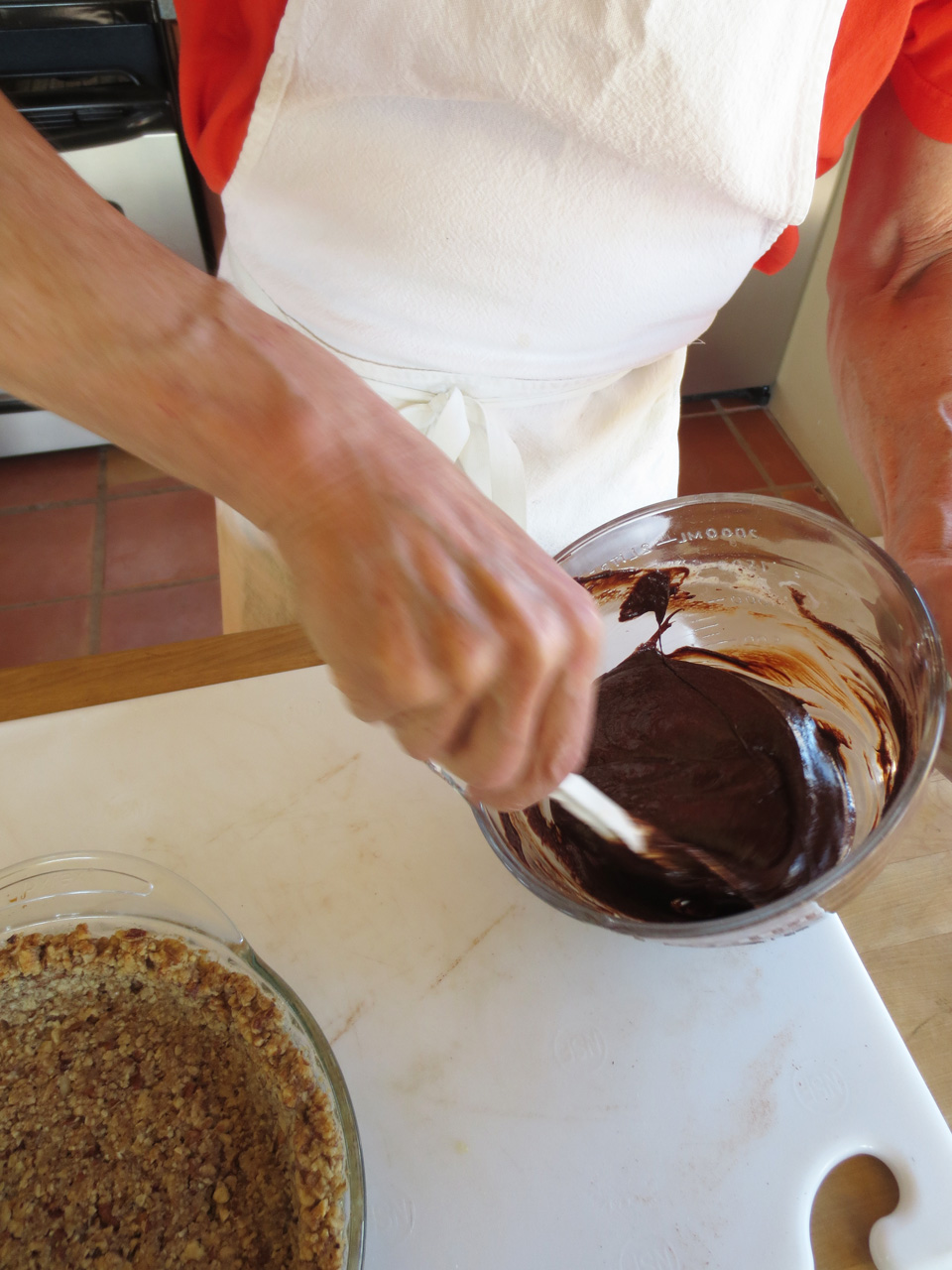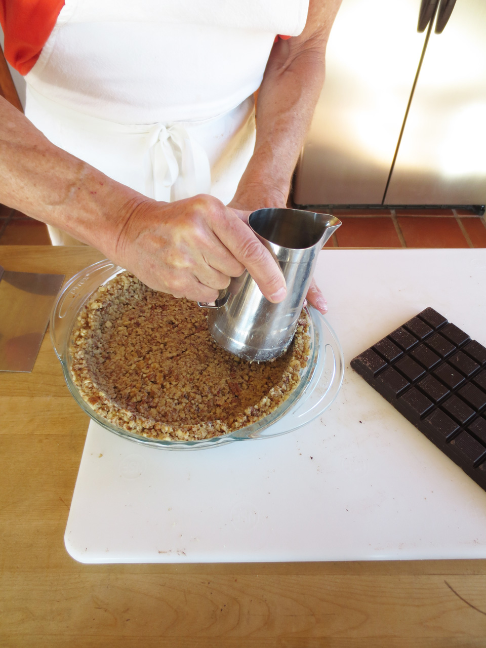 Bake about 10-15 minutes and cool while preparing the filling. (If nut mixture changes shape, re-shape to dish while still warm).