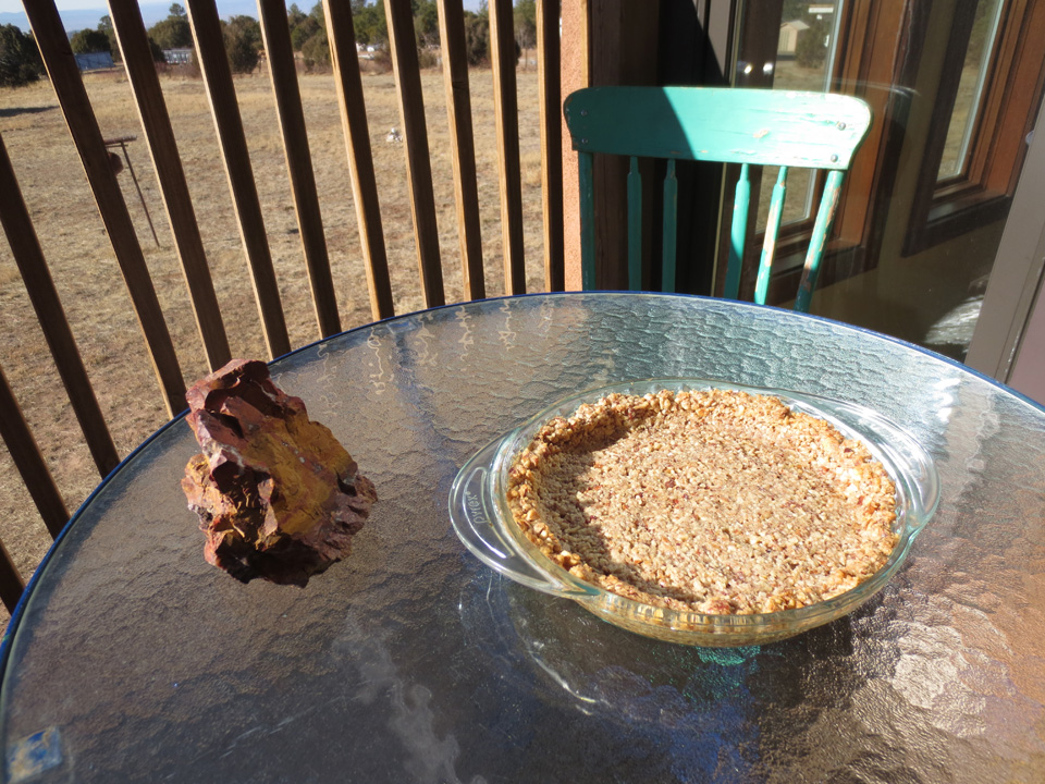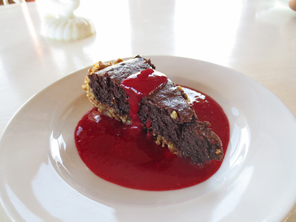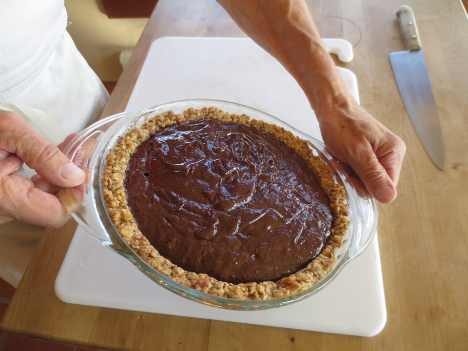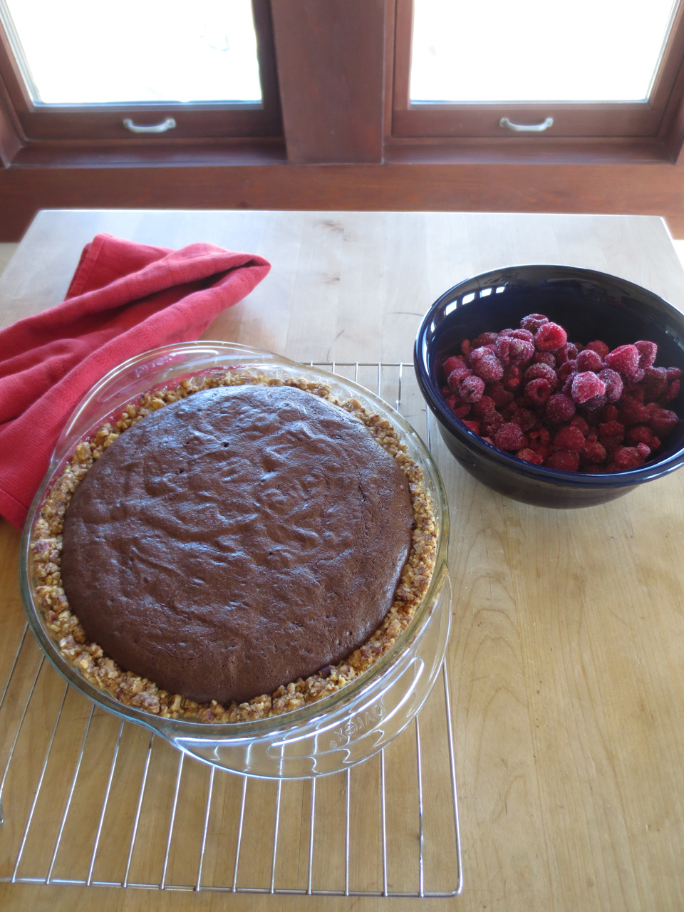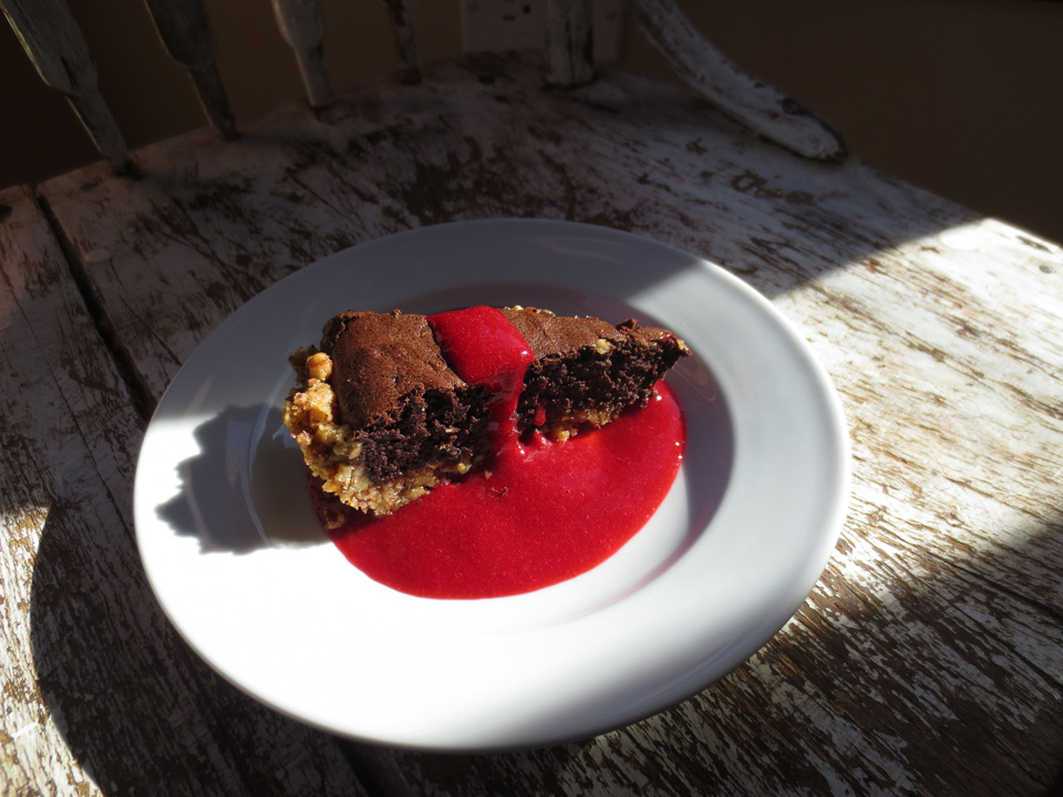 Kim (see previous post A Very Mini Artist’s Colony in New Mexico) had the urge to make this fabulous dark chocolate pie with nut crust yesterday. What a revelation! I’ve only ever had chocolate CREAM pie, which creates a kind of milk chocolate/pudding experience. This pie is like having the very best dark chocolate you’ve ever had, surrounded by oven roasted nuts that somehow meld with it, and then served with raspberry sauce. I suspect it must have to do with the beaten eggs, but there is something like a cake quality to the finished pie. There simply aren’t enough words to tell you how utterly perfect this pie is. So I guess you’ll just have to make one for yourselves to find out.