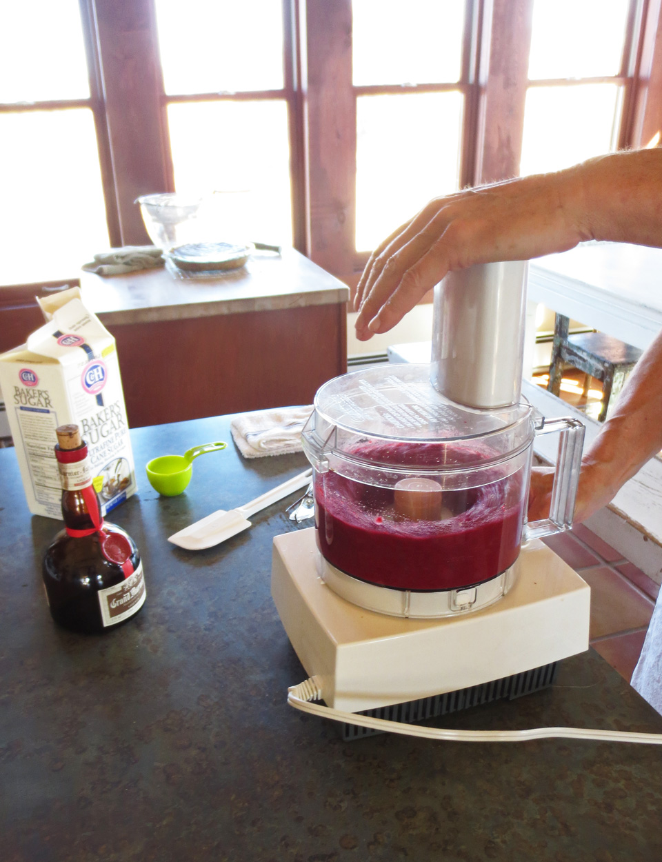 Thaw raspberries almost completely. Put into food processor with sugar, Grand Marnier and blade attachment. Process for 30 seconds or so till smooth and combined.