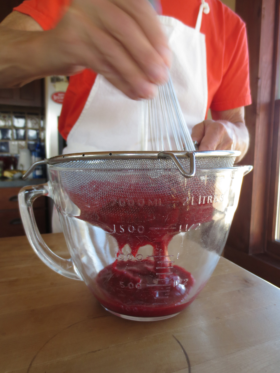 Lay a wide common sieve over a bowl. Pour the pulp into it and run a whisk round and round, slowly extruding the raspberry sauce through the sieve and into the bowl below, leaving the seeds and pulp in the sieve. Use a spatula to scrape the bottom of the strainer afterwards, to get all of the sauce, and then throw away the seeds. If there’s difficulty in this process, it may be that the pulp is still too frozen and needs to thaw a bit more before trying the whisking procedure.