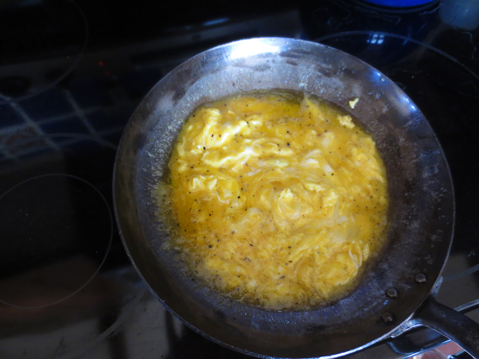 So here’s a simple pleasure from my Sunday morning: the beauty of eggs slowly cooking in Irish butter, an old, well seasoned, carbon steel pan from France (I almost feel transported to a little village in the south of France, don’t you?). That’s real beauty worthy of a photo I’m thinking. Simply gorgeous: