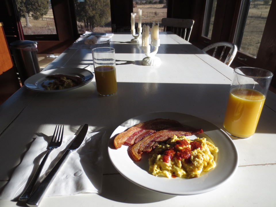 And, of course, sitting down to a fabulous breakfast of eggs, salsa and thick-sliced bacon, with a good friend after a brisk walk at sunrise, the dogs ranging through the pastures in sheer glee: