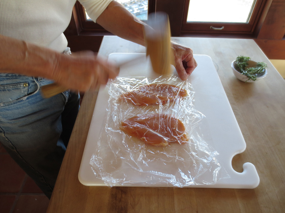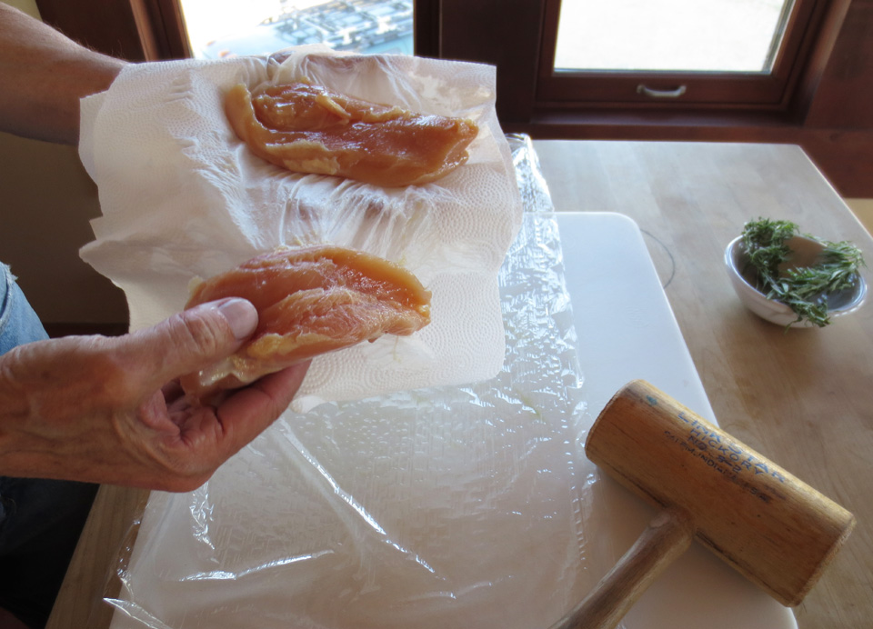 Lay out long enough sheet of plastic wrap to fold over chicken breasts and pound till evenly flattened about 1/2” thick and season both sides with salt and pepper.
