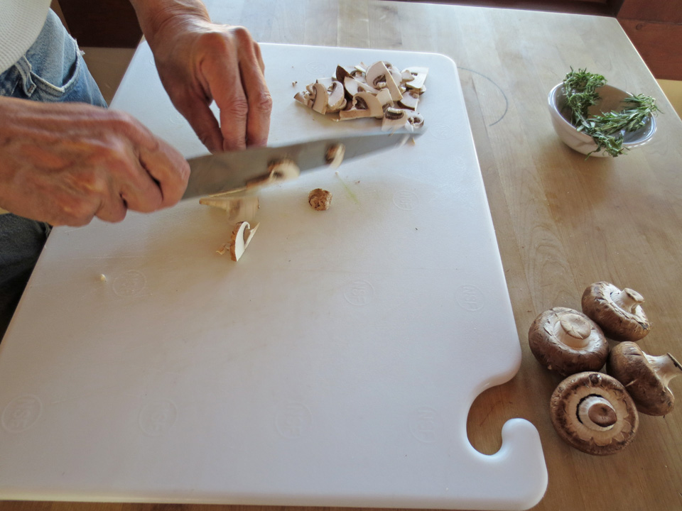 Clean the mushrooms and slice 1/4” across. They can be halved first if large.