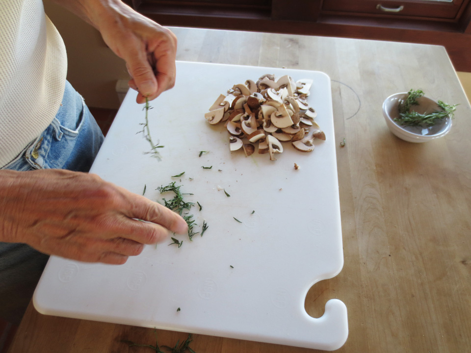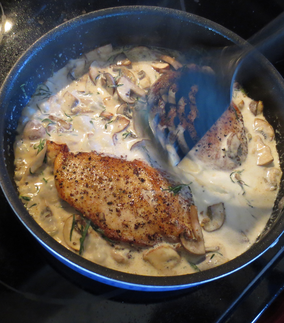 … then the tarragon leaves, moving them both through the mushrooms with a spoon, and around the chicken breasts for another minute…