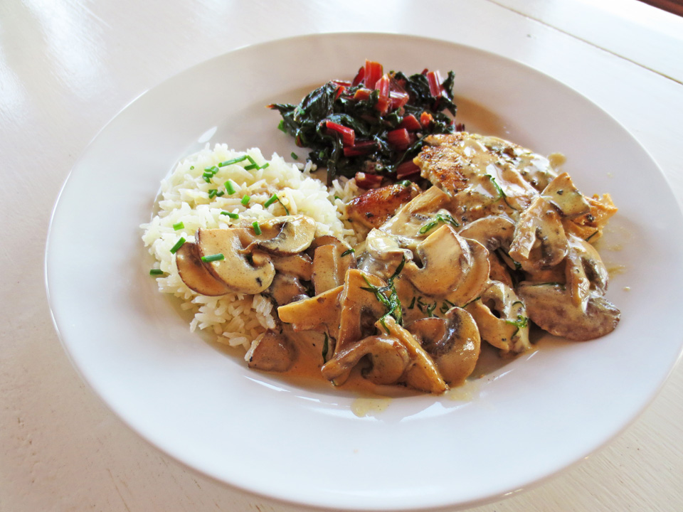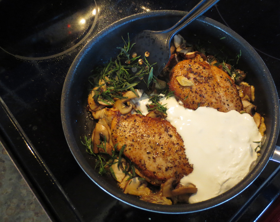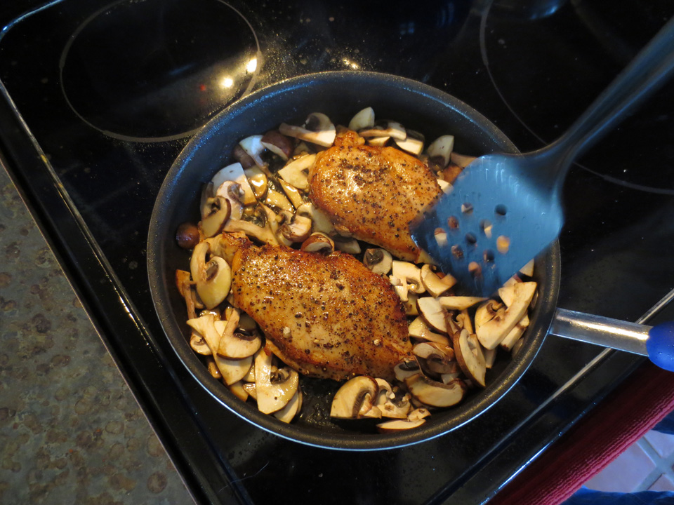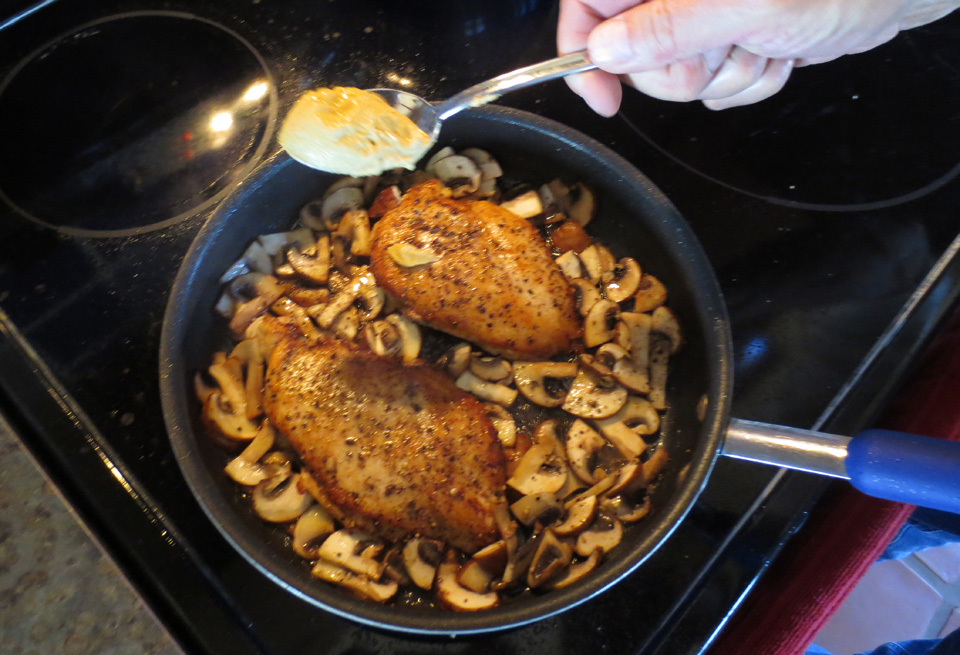 When the second side of the chicken and mushrooms have cooked for about 2 minutes, add the mustard…