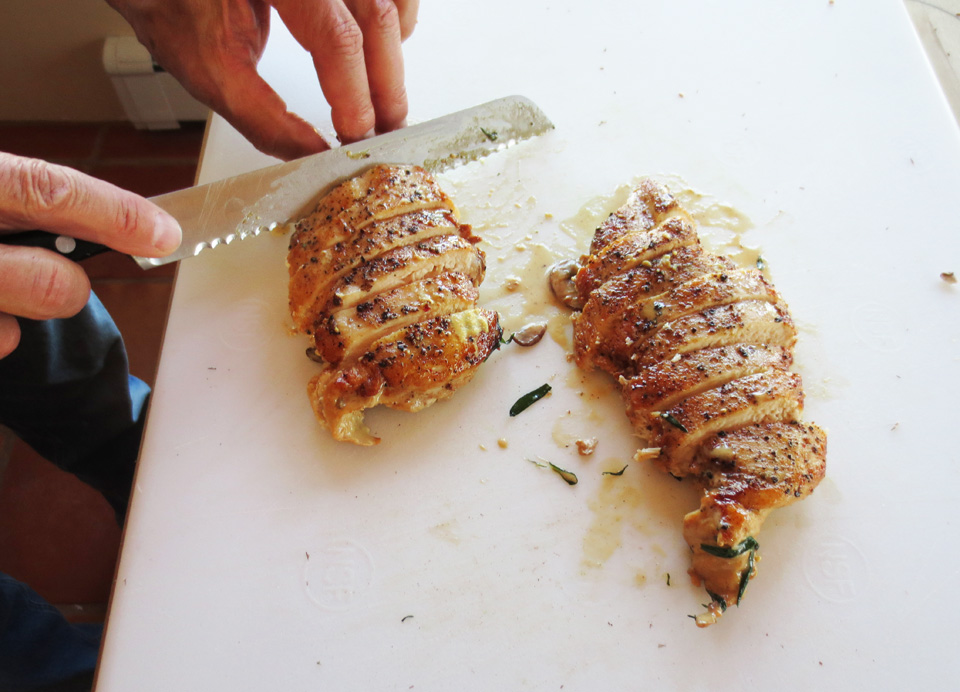 Lower the heat and remove the chicken breast to a cutting board, slicing them about 1/2” on an angle: