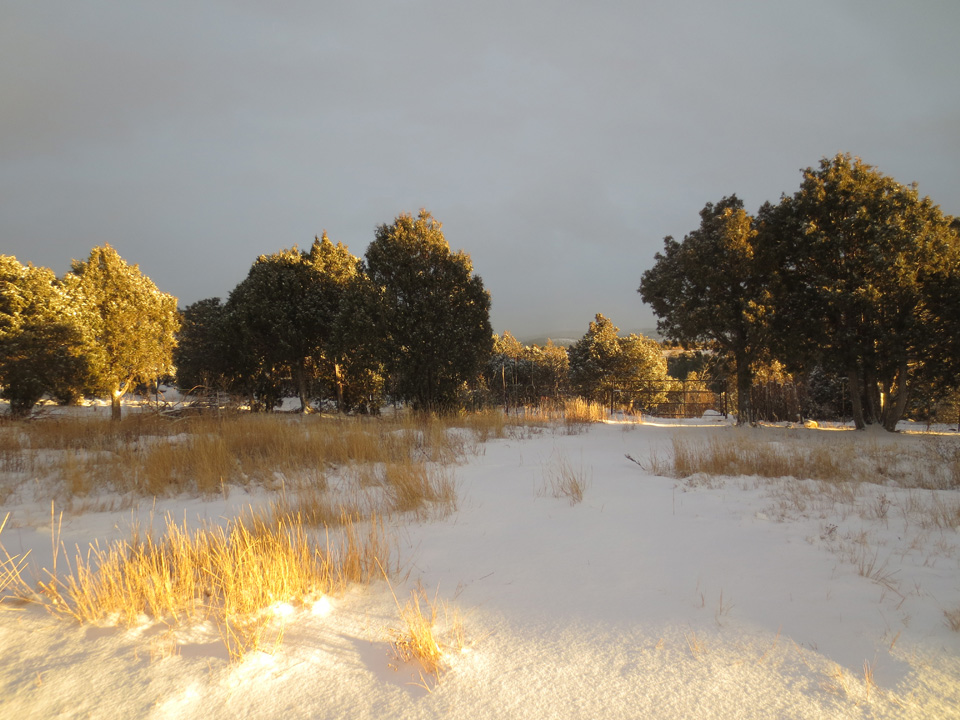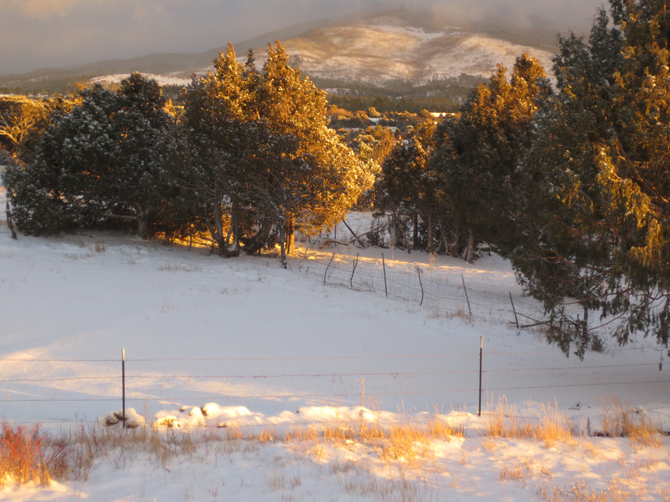 It finally snowed up here on the mountain! Not as much as we want or need, but it is stunningly beautiful anyway. It was 10 degrees when I walked the dogs this morning. I had definitely waited for the sun to rise before heading out. It was 0 degrees when I got up. Brrrrr. Very chilly indeed. But it was warm and dry inside my house with the wood heater blazing throughout the night. Finn certainly appreciated that.