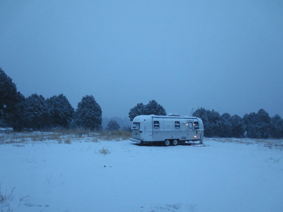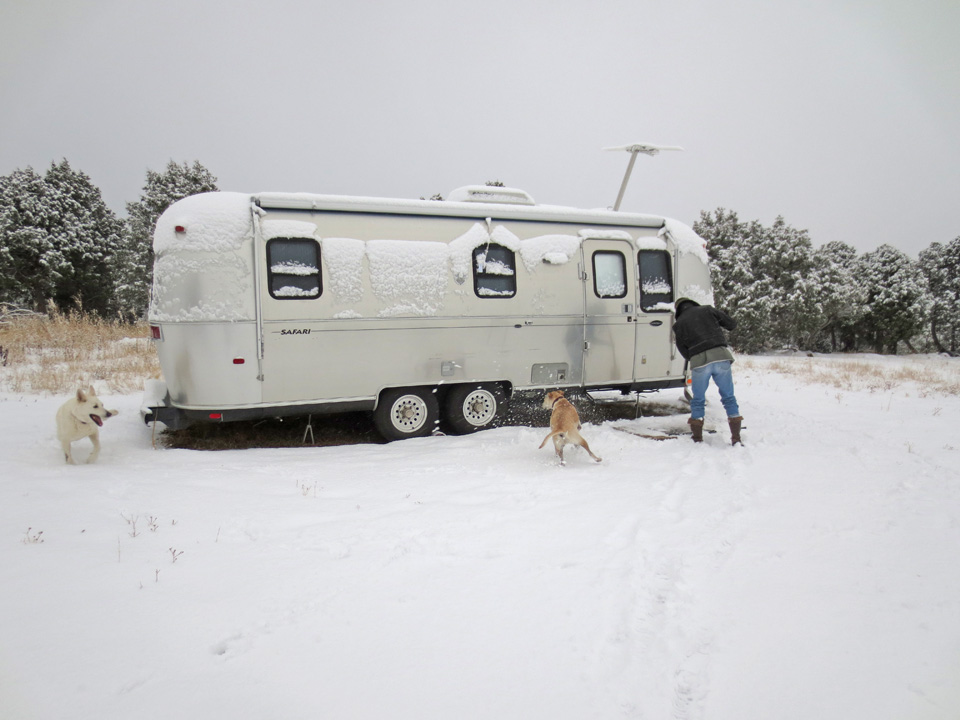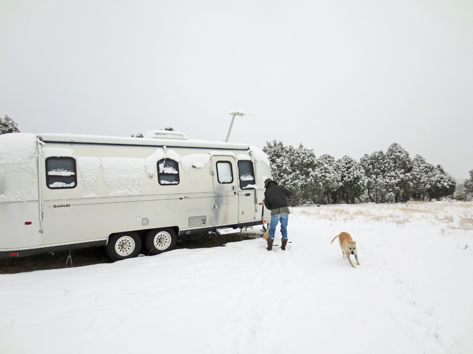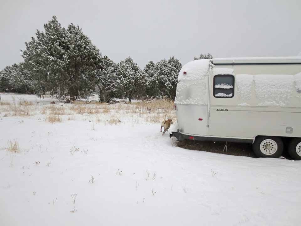 My Finn is not a snow man for sure (he gets very chilly), but he is always up for a walk, no matter the weather. He made a couple of loops around the trailer, waiting for Kim: