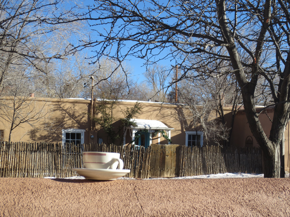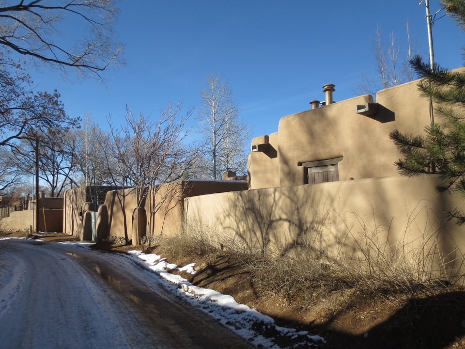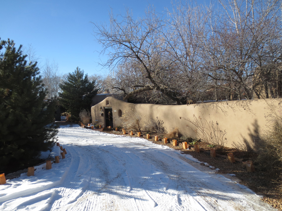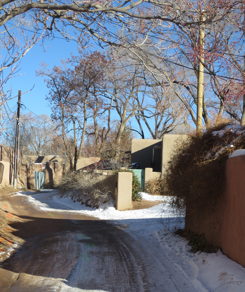 After coffee I took a stroll through the neighborhood and, although they hadn’t received as much snow as we had at 8500 feet, it was still very beautiful. And I realized many of you don’t live in New Mexico and these kinds of sweet, little, adobe neighborhoods, and tiny, winding, streets, aren’t available to you. So I took some photos. I hope they’ll give you a bit of the very special experience of Christmas in Santa Fe. Merry Christmas!
