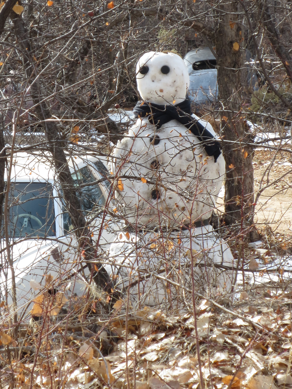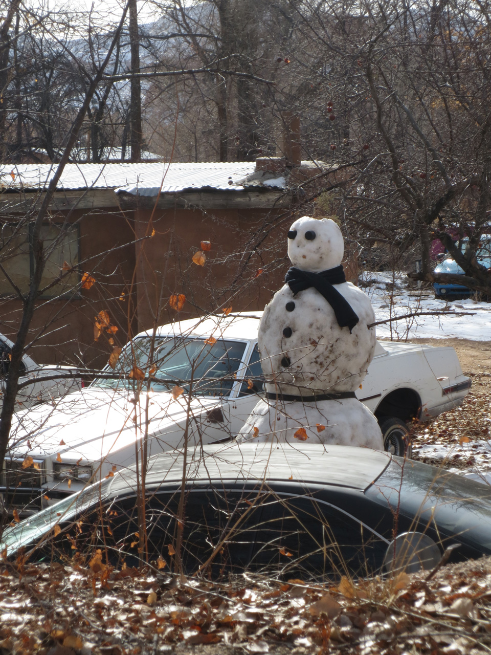But this time I turned around as soon as I could, parking my car on the side of the road and walking back. There, standing amidst old junker cars, in front of a dilapidated adobe and a trailer that had seen better years, stood this snowman, easily eight feet tall, its twig arms spread wide in hopes of a hug.