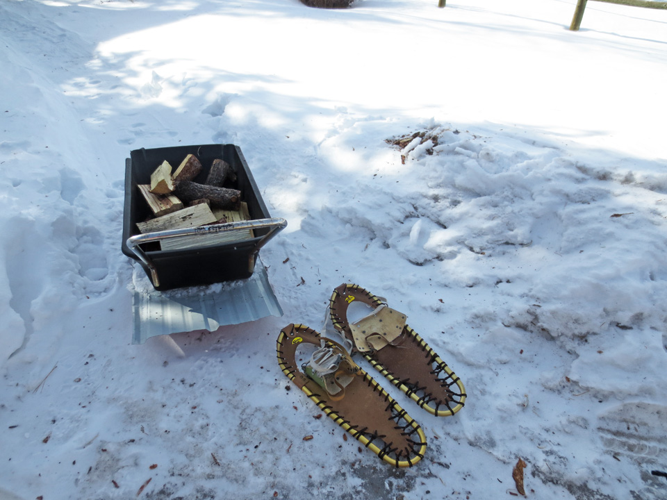 We were met by this wonderful invention of Kim’s outside the kitchen door. It’s a sled he constructed out of a big wheelbarrow and some metal sheeting fashioned into a slider for the bottom of the thing. The metal tips up in the front like a big ski. Those are his snow shoes sitting nearby because every morning he pushes this thing around the outside of the gallery to bring in his day’s supply of wood. Very clever indeed: