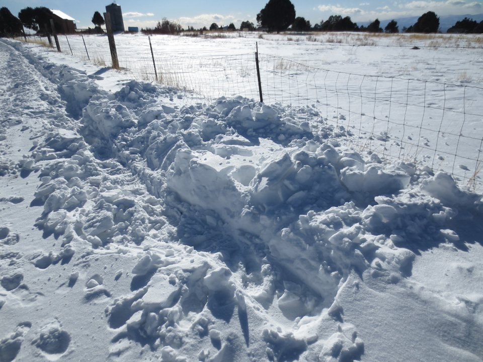 We had just a little bit of snow the other day–MAYBE 2″–but it was also intensely windy–I mean HOWLING winds. In fact it was so windy that the storm blew existing snow from the surrounding fields onto my road, leaving it settled there in pretty deep drifts. I didn’t know this until I tried to drive out.