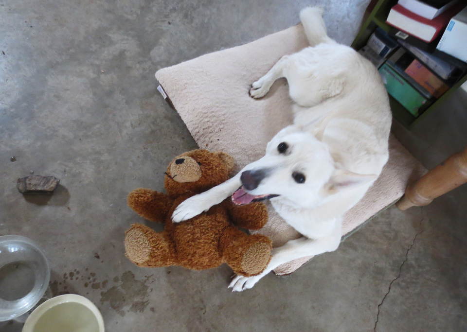 But Kelee isn’t much for wood heaters. In fact he’s more of a snow kind of guy. So he’s lounging on the bed furthest from the fire, cuddling his new stuffed bear I bought him for 50 cents at the recycle store. He slept with it last night (but don’t tell him I told you so).