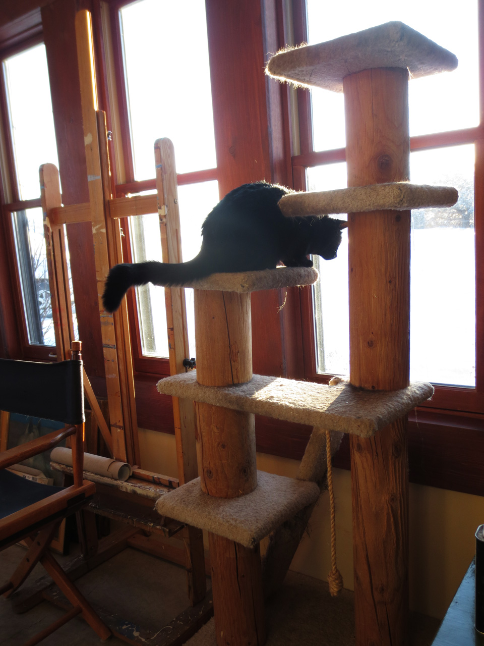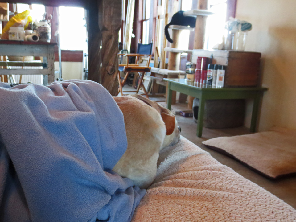 The snow outside my studio window is alive with bluebirds, feasting on the seeds I sowed for them just before the sun came up. I don’t know how they survive in this kind of weather and feel they certainly deserve a little support. They provide Raven with hours of entertainment. Look at him, lost in his dreams. We all have to dream, right?