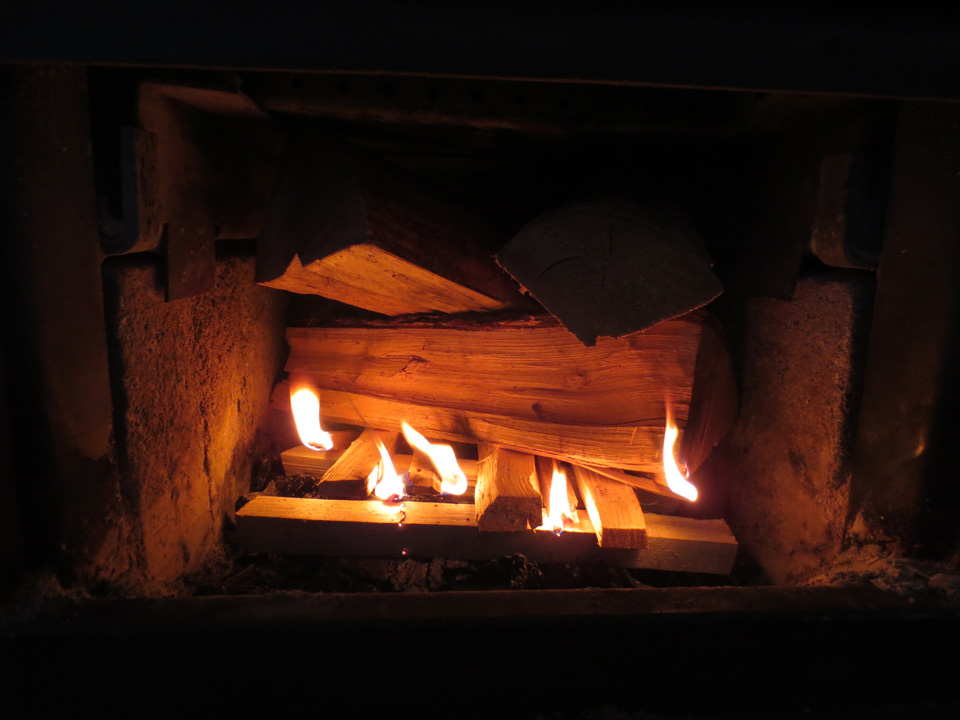 … which called for a fire in the wood heater immediately (since I heat entirely with wood it’s always my first task), starting with fabulous “pitch sticks” I buy from Jessie. This is kindling harvested from inside of a tree that is still saturated with sap. Some of the sticks absolutely drip with it, so it really only takes one to start a fire, but I always use a few more because I love the smell. It’s like having 100 Christmas trees in my studio.