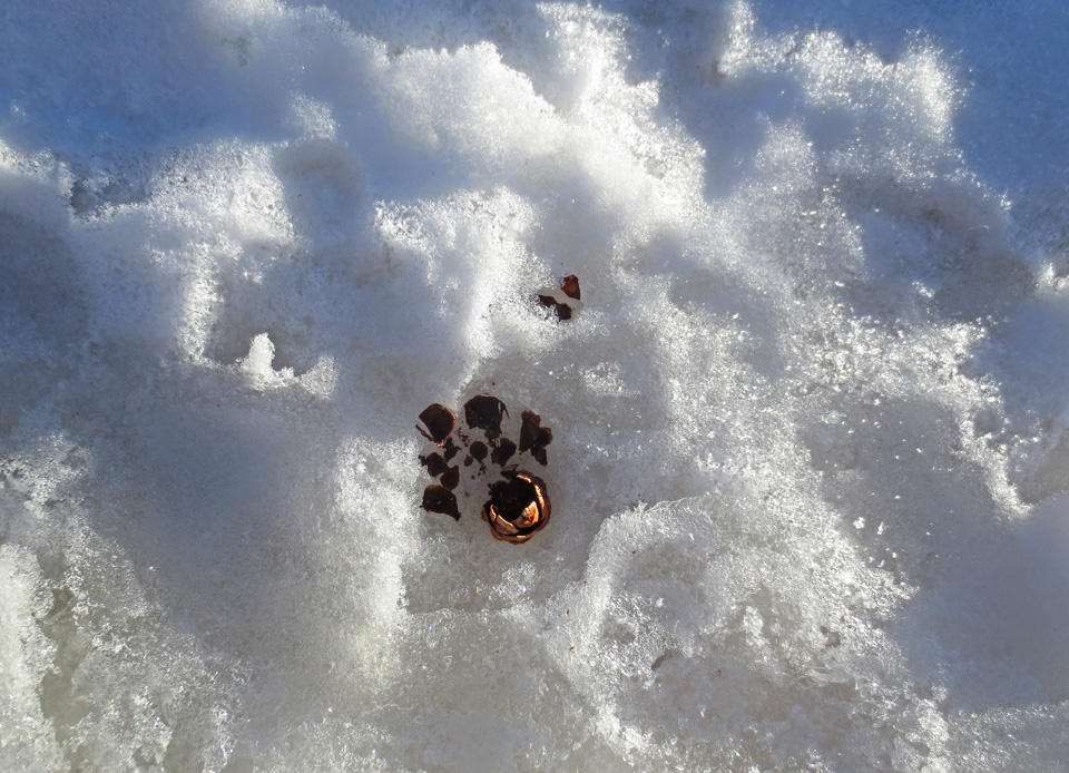 The other day, walking out on the land grant, I came across this. It’s a small pine cone that some little critter shelled and ate–right there in that patch of snow–the heart of the cone eaten away.