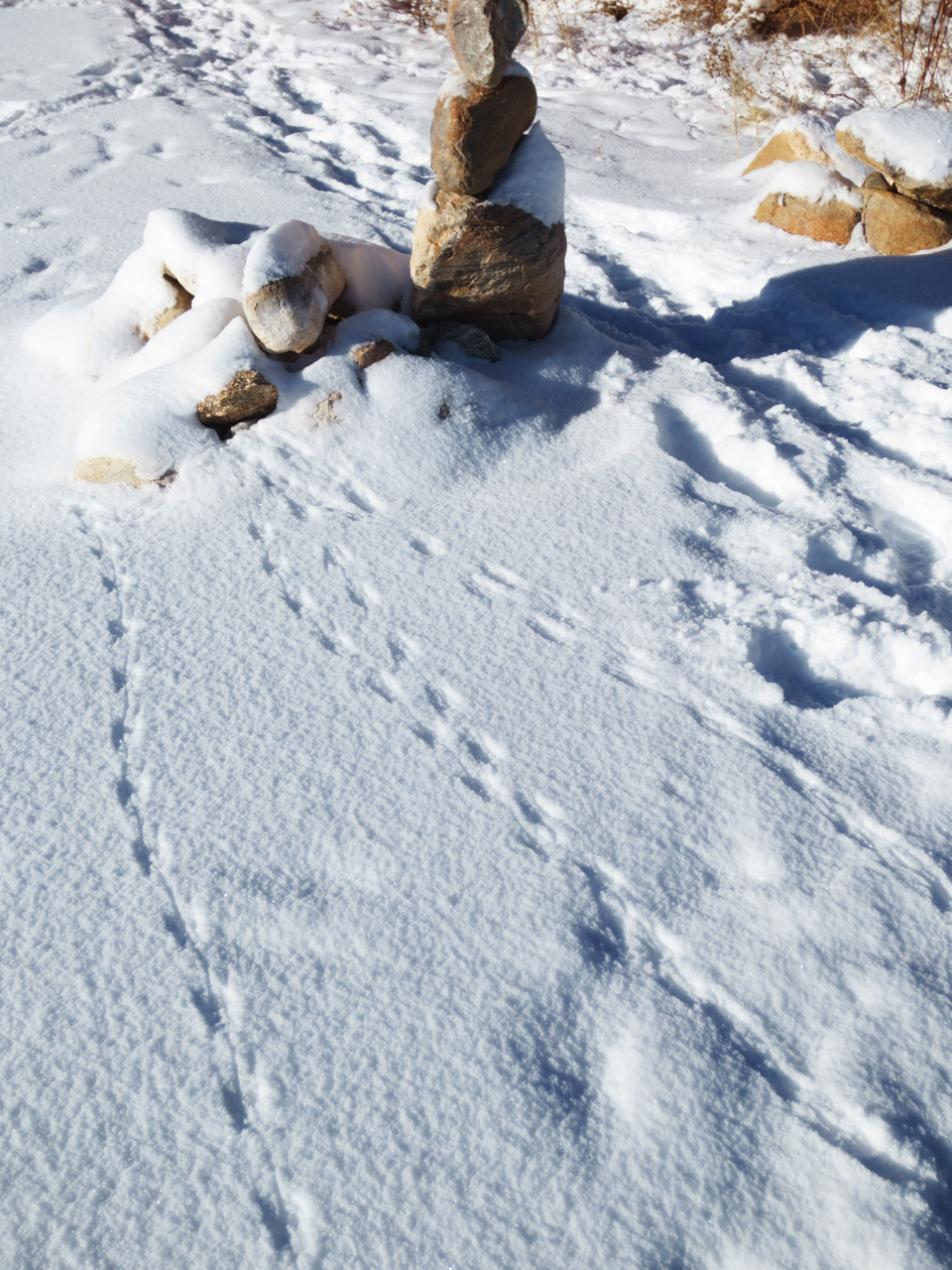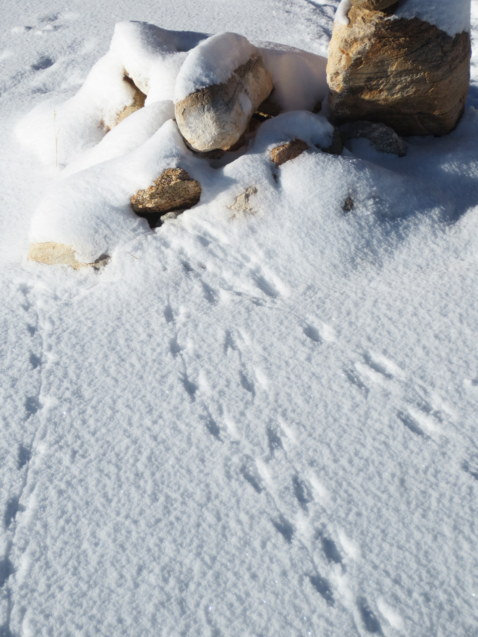 … and last night, coming home from dinner, I noticed something. When I get out of my car, the headlights stay on for awhile (a nice feature since it’s pitch black up here when there’s no moon) and it created some amazing shadow and light. Because of this strong light I noticed three sets of tiny little footprints in the snow, heading for my stack of rocks. When I looked closer I saw that all three led right up to the rocks, and then there were little scuffle marks showing they’d squeezed themselves in.