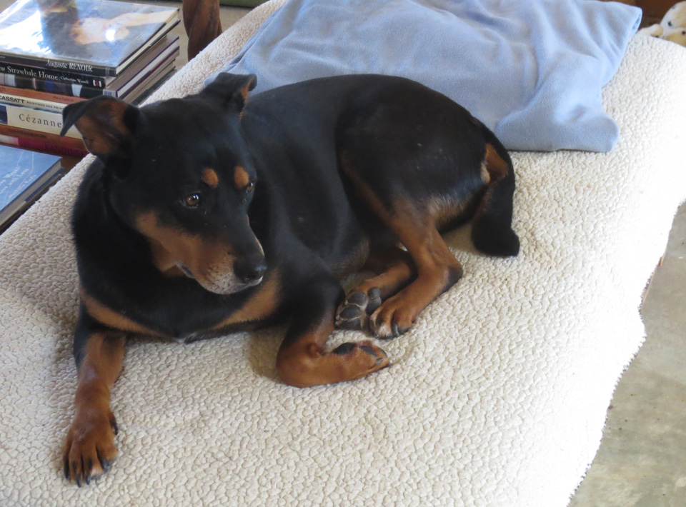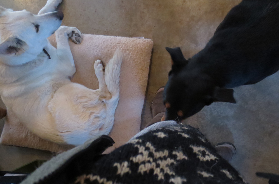 She would let me CAREFULLY pet her when I tucked the dogs into their beds at night–but not too much and not too close. She was, I should note, very comfortable with the other dogs, Kelee who raised her, and the newer-comer, Finny. She adores them both. I was another story, however. Definitely not a member of Skye’s comfort club.