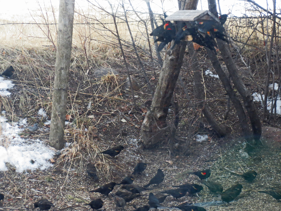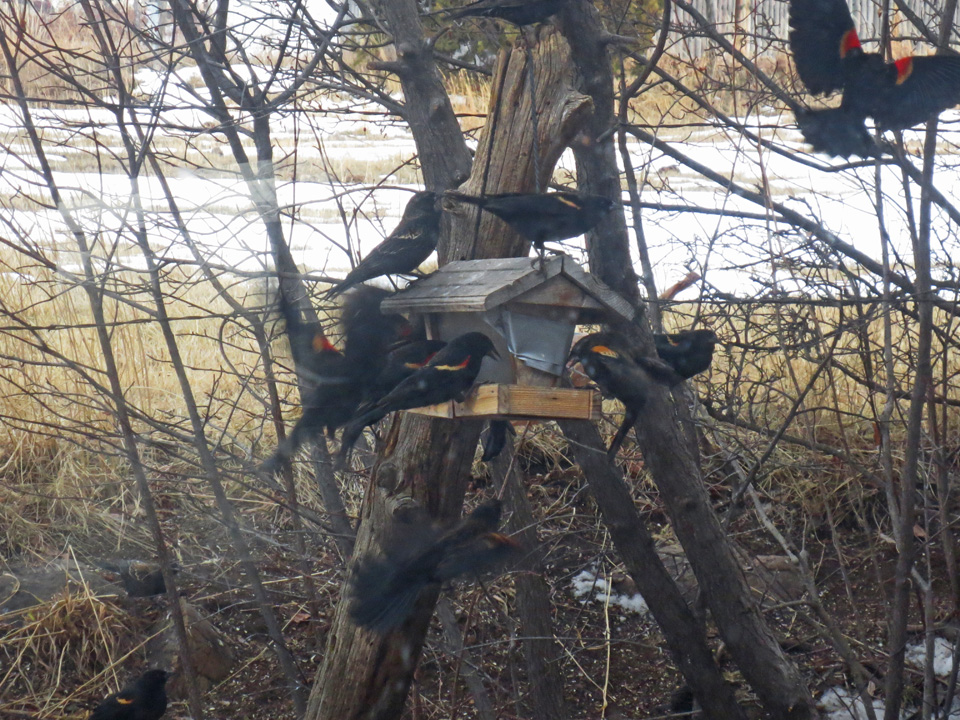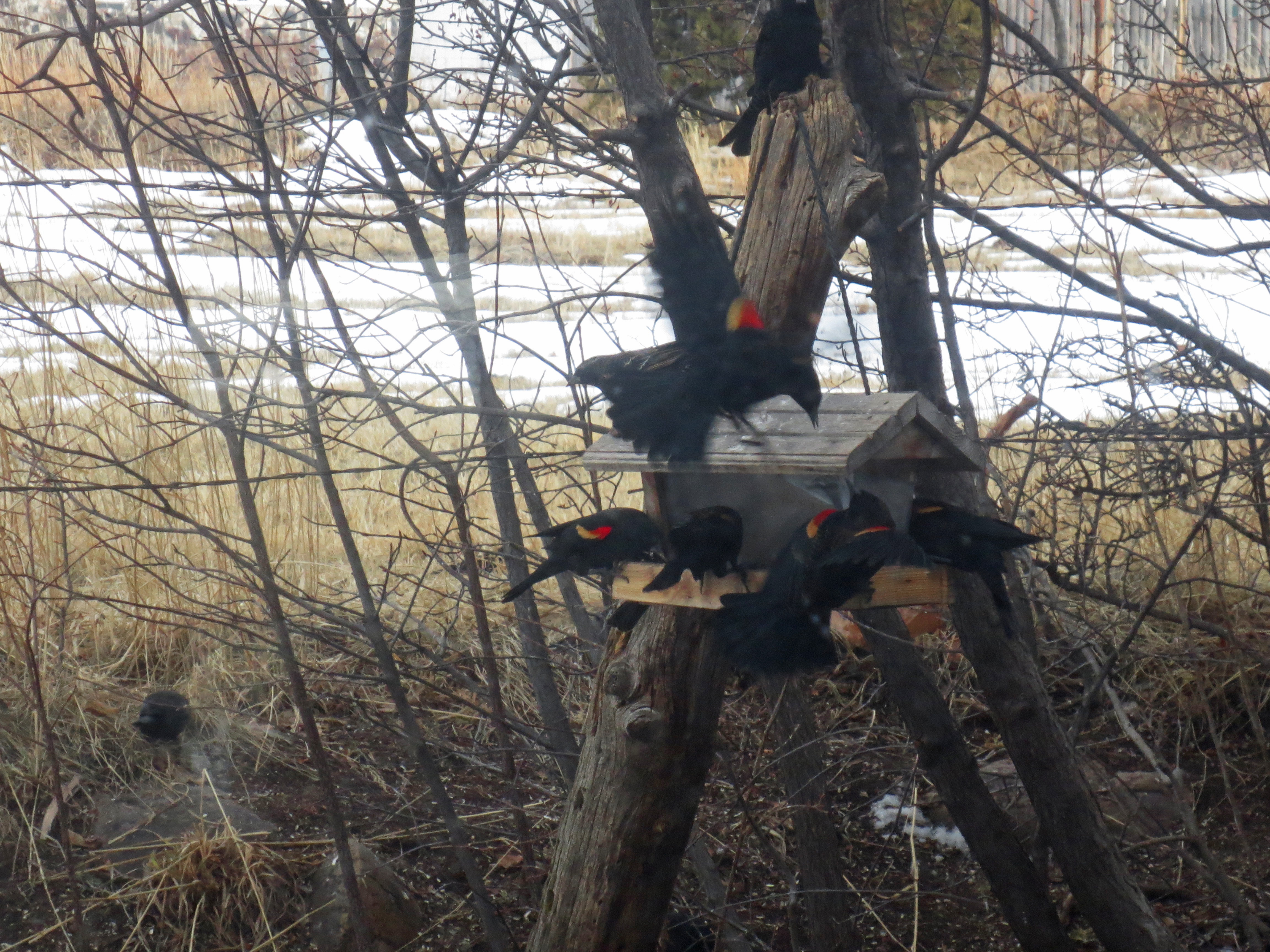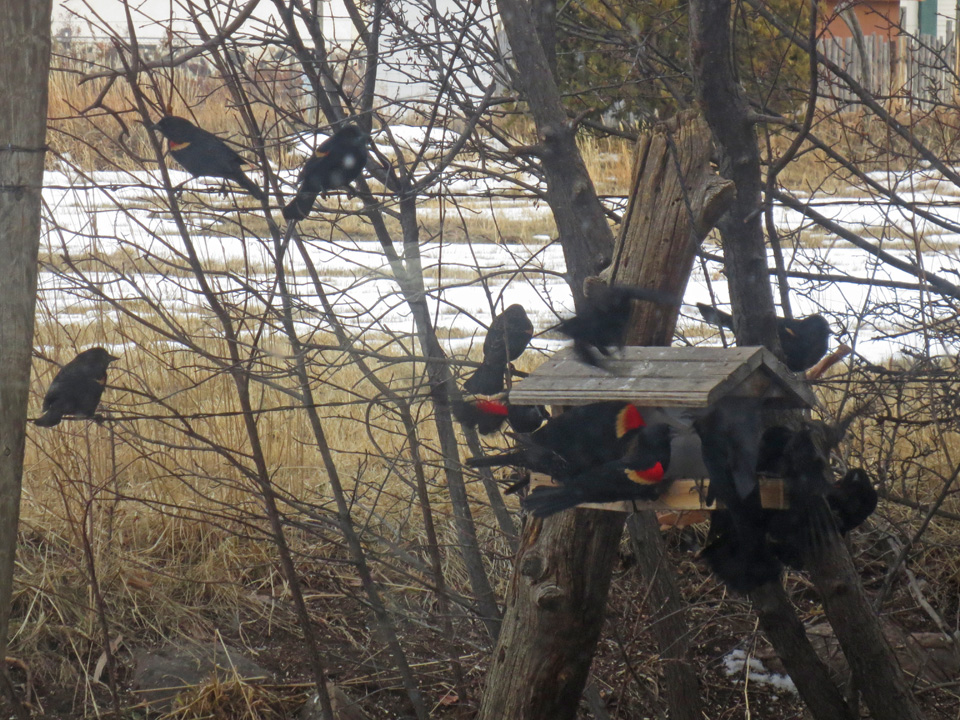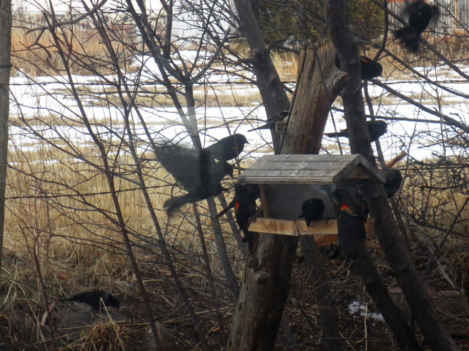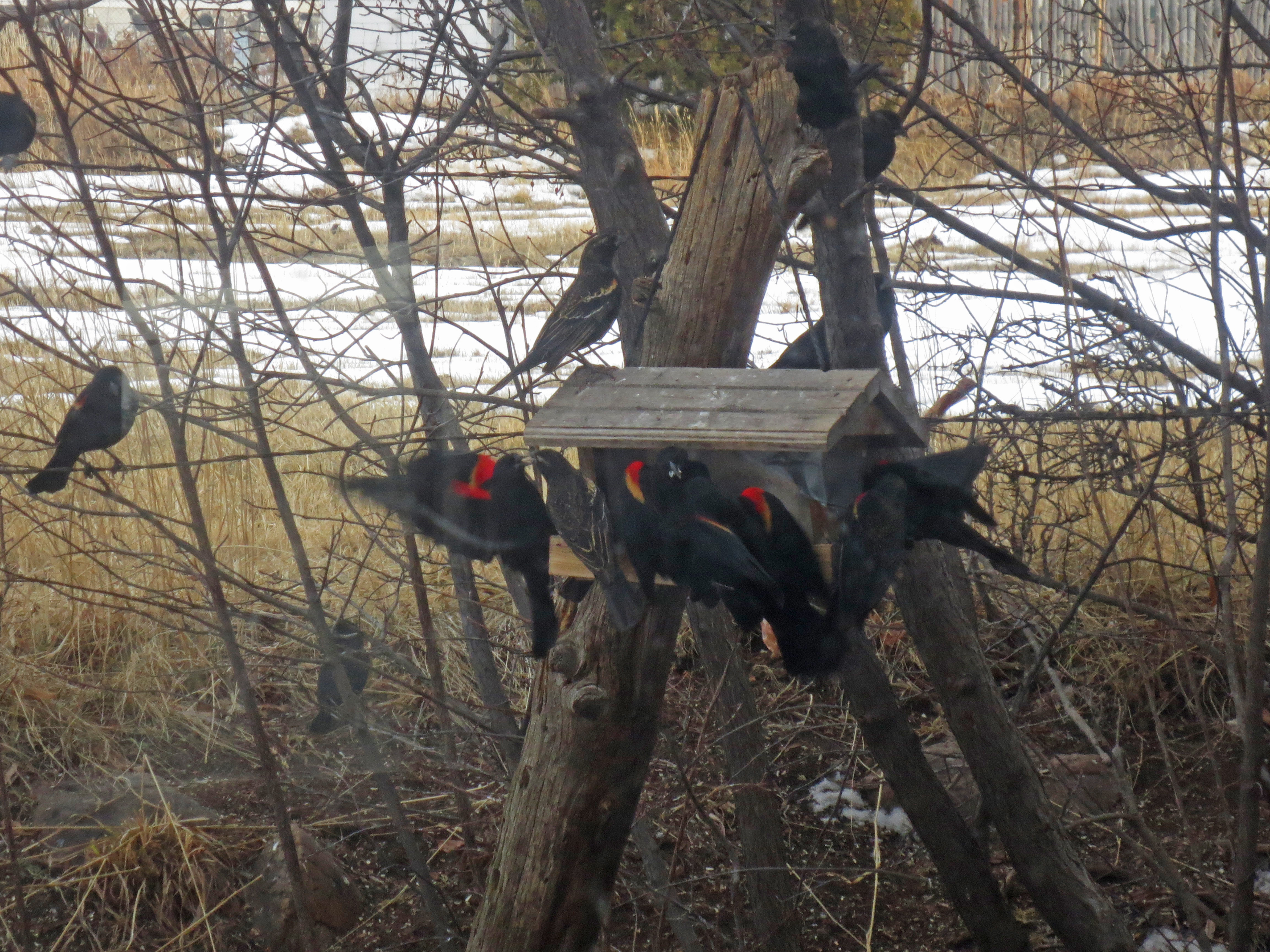 I was over at Kim’s the other night (see previous post Living in an Art Gallery) helping to put dinner together when I looked out the window that is just over the kitchen sink. It’s where Margaret keeps her bird feeder–such a perfect place for viewing. The ground is almost flush with the base of the window so it’s as though the birds are part of the kitchen–a rather large flock of dinner guests. And on this night we were visited by a surprising number of Red-winged Blackbirds. Oh my. I love these birds.