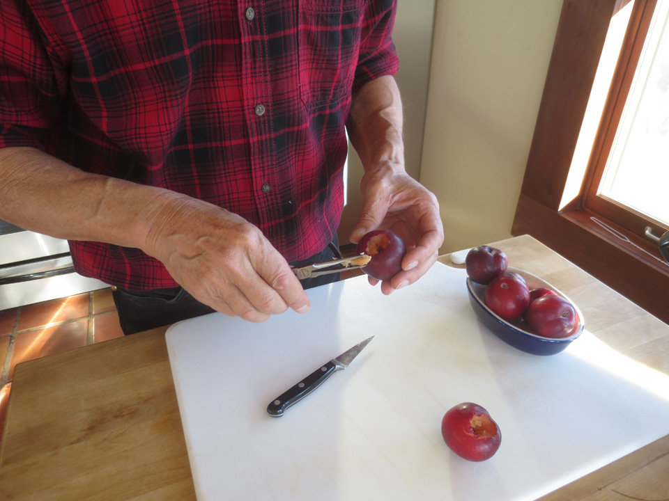 First pit plums with a sharp pointed knife, making a small circular incision where the stem was attached without damaging the plum too much, and put aside. Kim used small, needle nosed pliers to extract the pit, or use a small spoon.