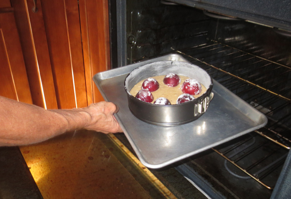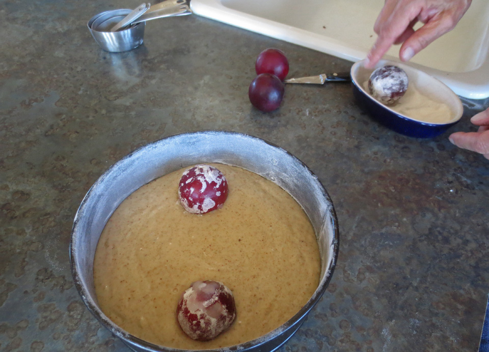 Roll each of the plums in water, then in the sugar, and press hole side down in the batter, evenly and slightly in from the edge of pan, in a circle…