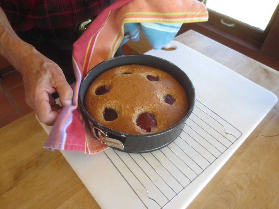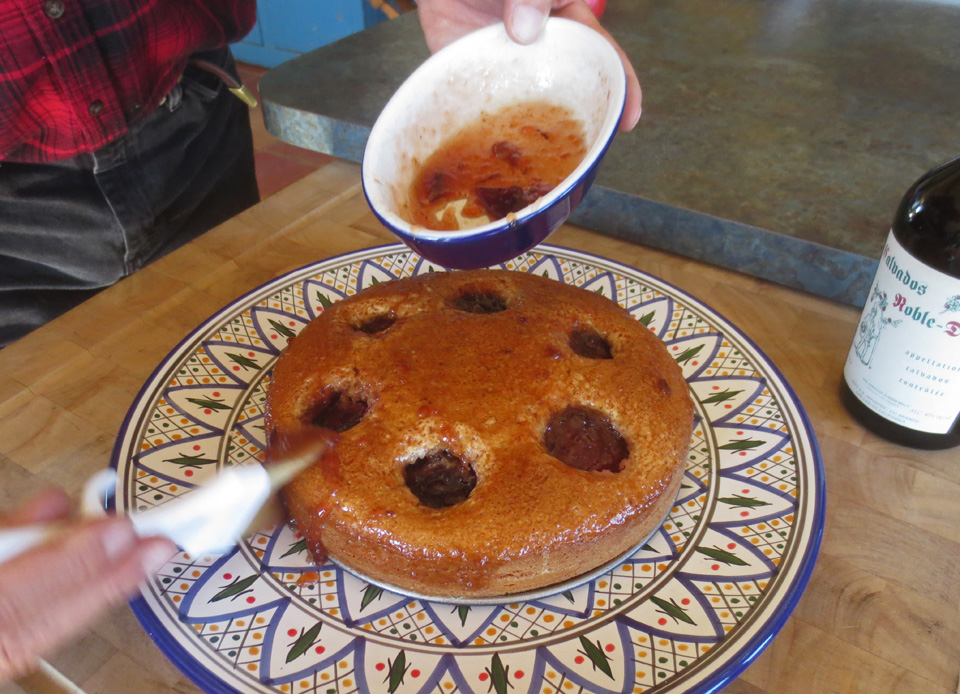 (Variation: Kim used an extra plum to garnish the top of the cake. First he sliced it and brazed it in Calvados until just tender).