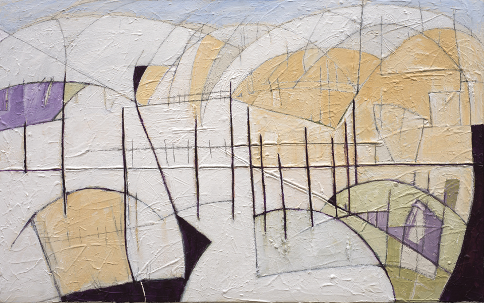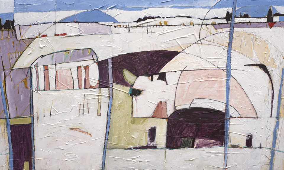 Unlike the Taos Moderns before her who worked hard to avoid any kind of representation, Weigel doesn’t shy away from it. In fact she endeavors to capture the essence of the land she has come to know and respect in her paintings. Stick fences that stitch across the landscape she sees from her porch have become a recurring theme, along with the mountains and the Espanola Valley.
