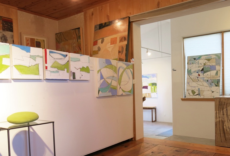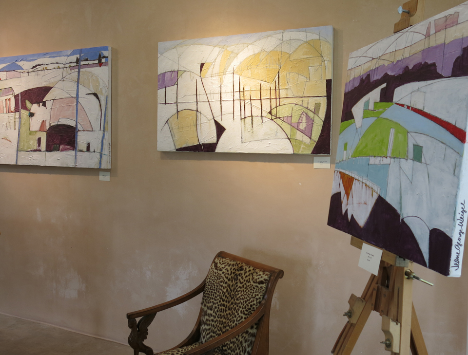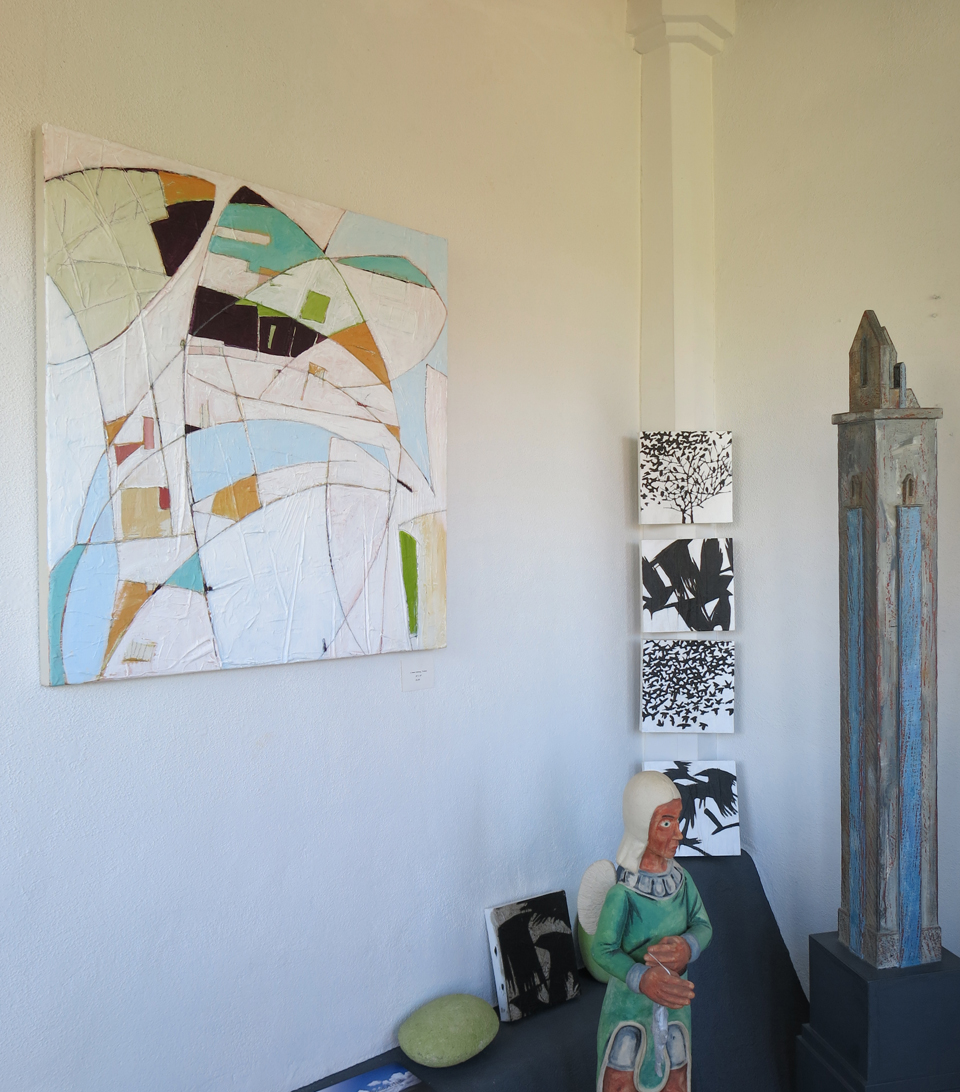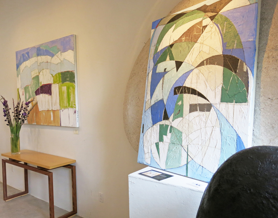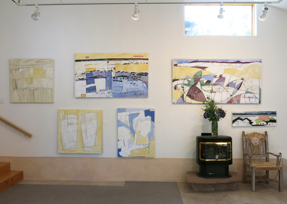 … then coming through what I call the “knotty pine room,” and peeking into the main exhibit. These paintings to the left are rather whimsical pieces inspired by the sweeping valley view from my land, hummingbirds at the feeder, spring winds and summer monsoons…