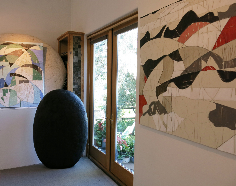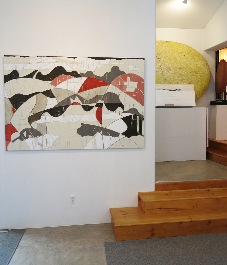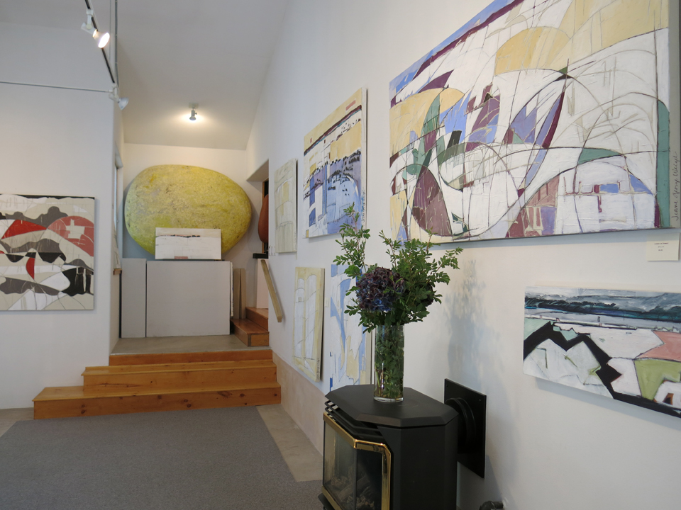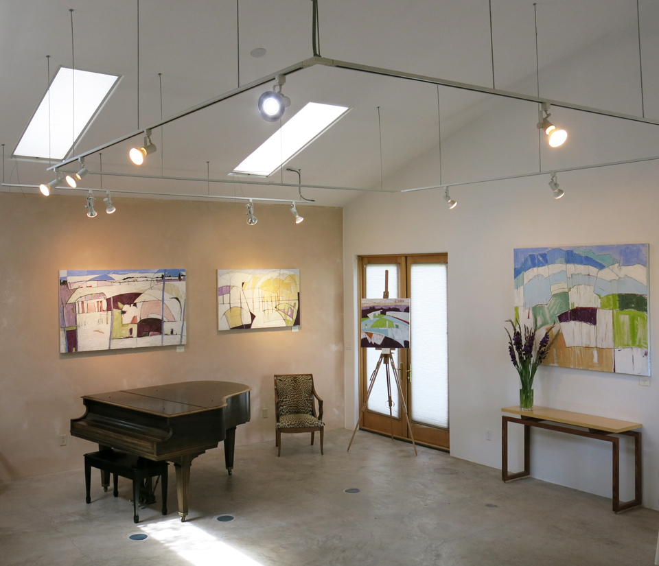 … then coming through what I call the “knotty pine room,” and peeking into the main exhibit. These paintings to the left are rather whimsical pieces inspired by the sweeping valley view from my land, hummingbirds at the feeder, spring winds and summer monsoons…