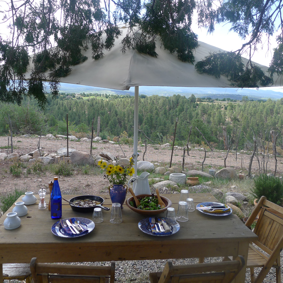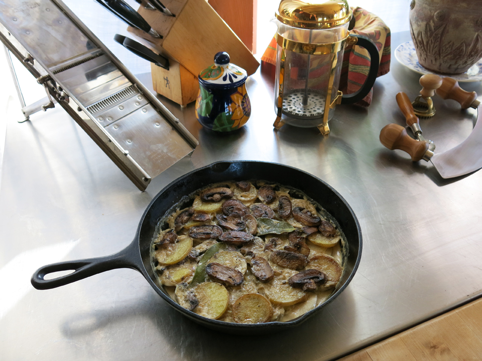 For this small luncheon with steak and salad, I took some medium/small Yukon gold potatoes, sliced them about 1/4” on a mandolin, par boiled them a few minutes, drained and laid on a towel to cool while I sautéed some sliced white mushroom caps in butter in a large pan. The large pan is to keep them individual and from steaming, the butter browning a bit, with liberal salt and pepper till well browned. Then tossed with the potatoes, more S&P and into a medium cast iron skillet, arranged to come up 3/4 to top, inserted 2 or 3 bay leaves partly under slices and poured heavy cream over just to top of potatoes. Onto a medium flame till mixture begins to boil, then to low flame as cream reduces. As the cream reduces to half, I covered the pan alternately to steam the top potatoes and continued till the cream was almost completely absorbed by the mixture, and removed from heat and kept covered. You could also use a 350 oven for the reduction. I served this right in the skillet for the relaxed outdoor atmosphere. The potatoes end up a delicious creamy consistency with a hint of bay and earthy mushroom bits throughout.