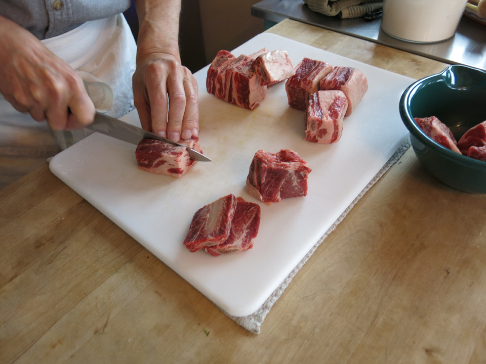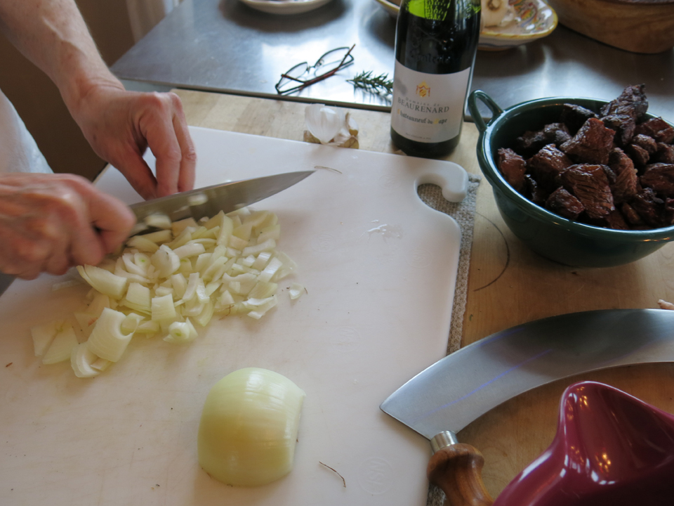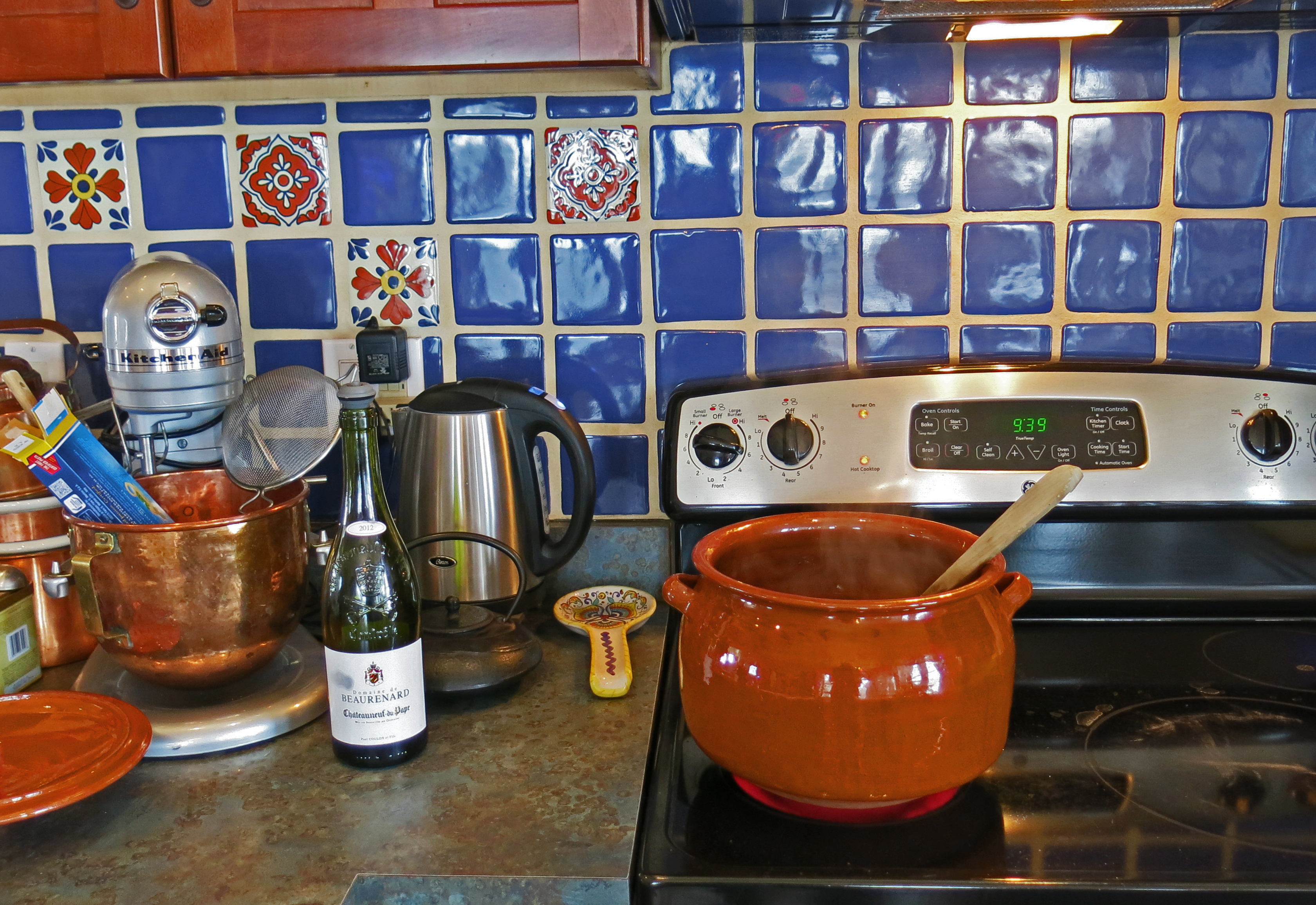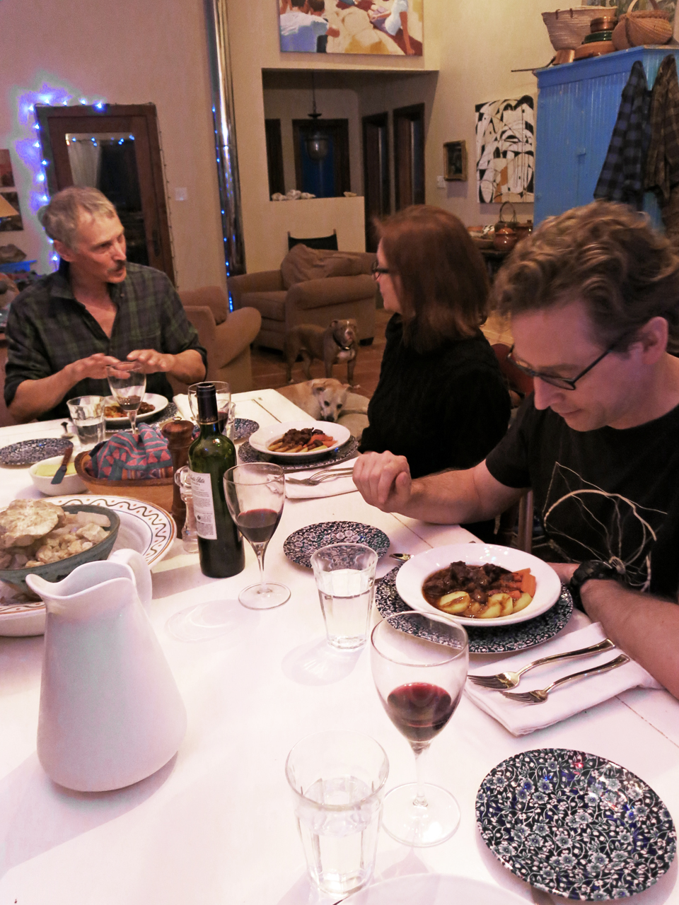 A big storm had been forecast so we headed down the mountain to get groceries and, lo and behold, we woke the next morning to a good amount of snow on the ground and it was still falling. A snow day! I don’t know what it’s like for the rest of you (except perhaps for those of you in the mid west and east who have been hit with storm after storm of ice and wind and snow), but not having grown up with it, in that sort of snow culture that gets used to having snow on the ground all winter, I always get a little giddy at the miracle of snow falling. And, although Kim (see previous post A Very Mini Artist’s Colony in New Mexico) did grow up in New England, he still gets excited about it too. So he decided to honor the day by making a nice pot of stew. What better way to warm up the house than with the good aromas of delicious food simmering on the stove and a loaf of fresh bread baking in the oven? And I thought it was high time you all had a chance to enjoy another wonderful recipe conceived by Kim Moss, this one loosely based on a Provencal classic. So I took notes and photos, just for you. Here you go:
